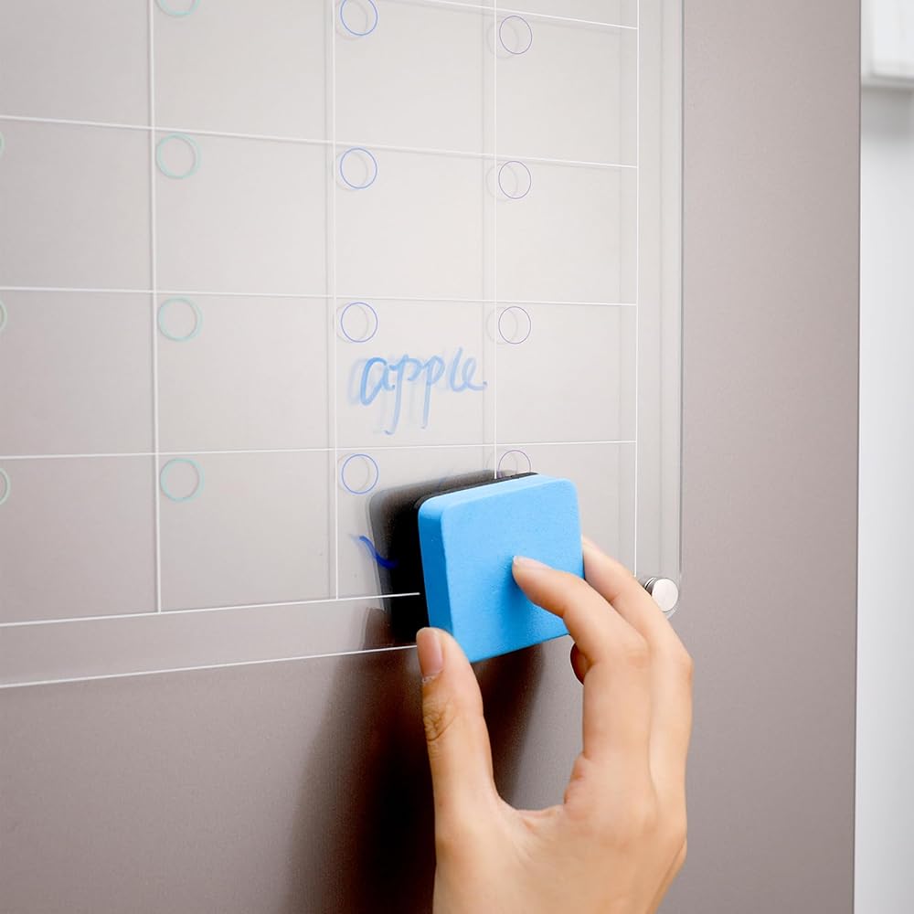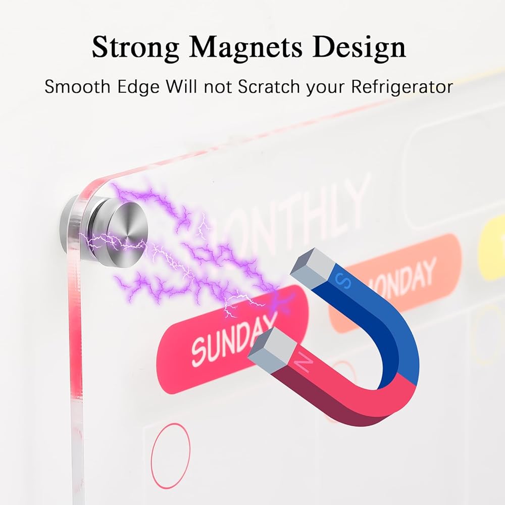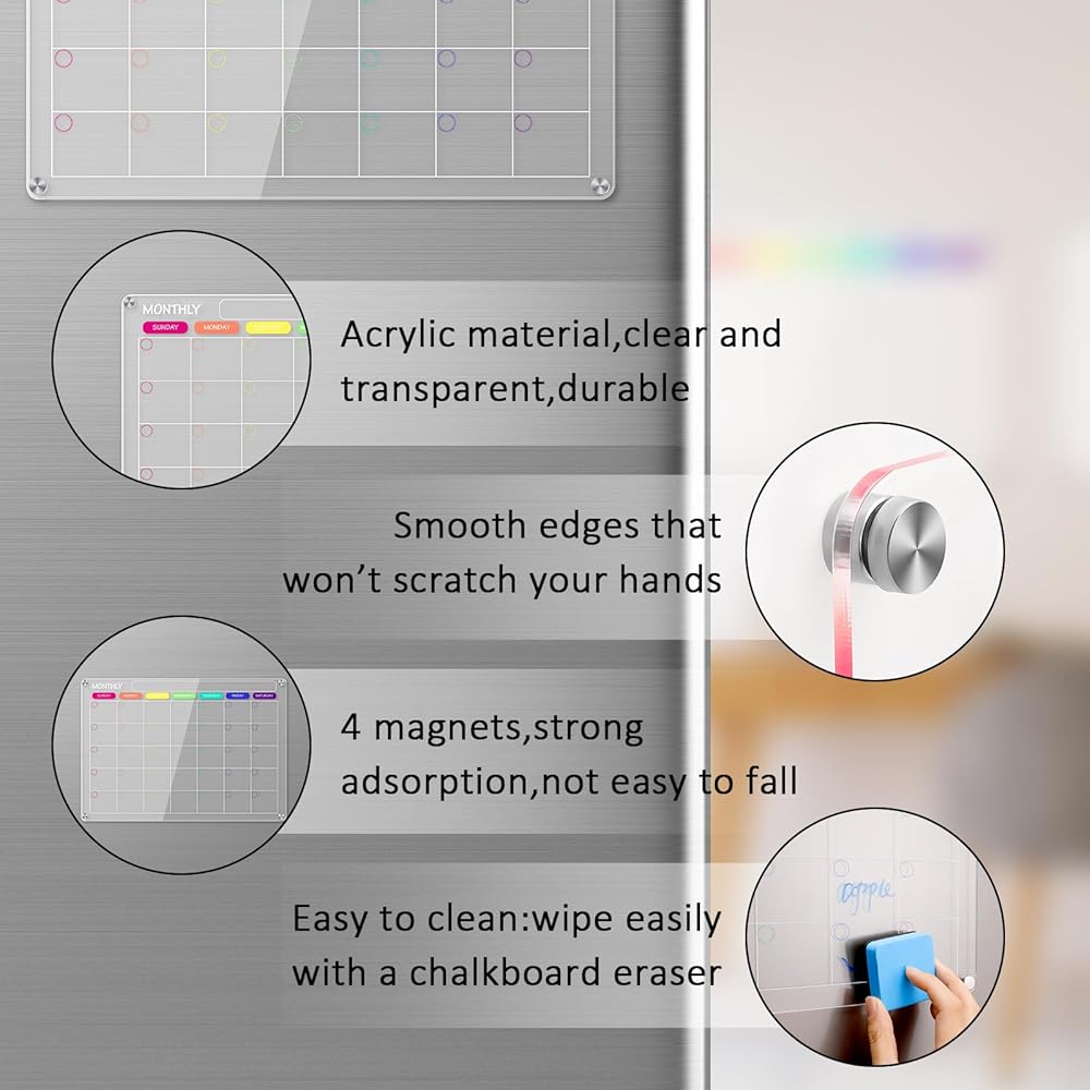 • Magnetic Markers & Easy Erase: This acrylic magnetic dry erase board and calendar for fridge comes with 8 dry erase markers in 8 different colors with magnetic attraction and an eraser cap, the writing is clear and easy to clean, you just need to wipe it off with a blackboard eraser or a damp cloth to reuse it again.
