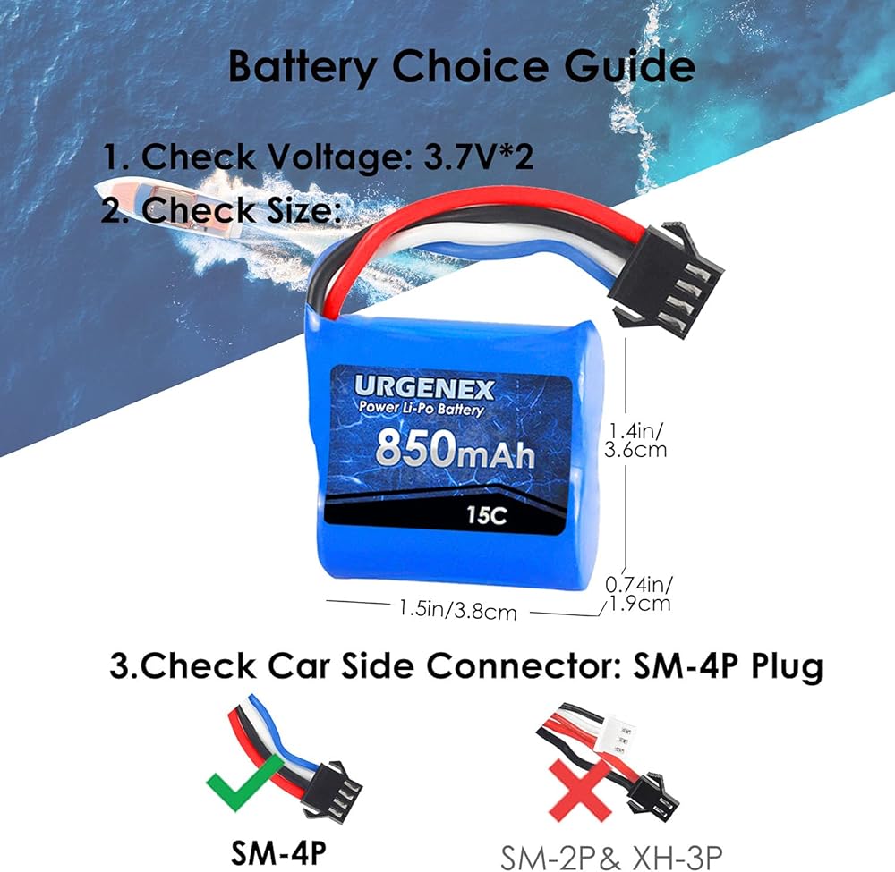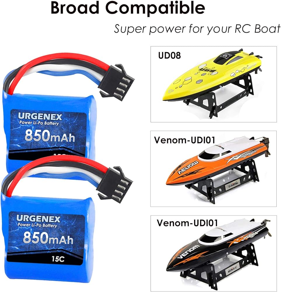 بطارية Urgenex Lipo 850mAh 7.4v (2 × 3.7 فولت) RC بطارية قارب مع SM-4P Plug UDI001 RC Boats بطاريات متوافقة مع RC Boat UDI008