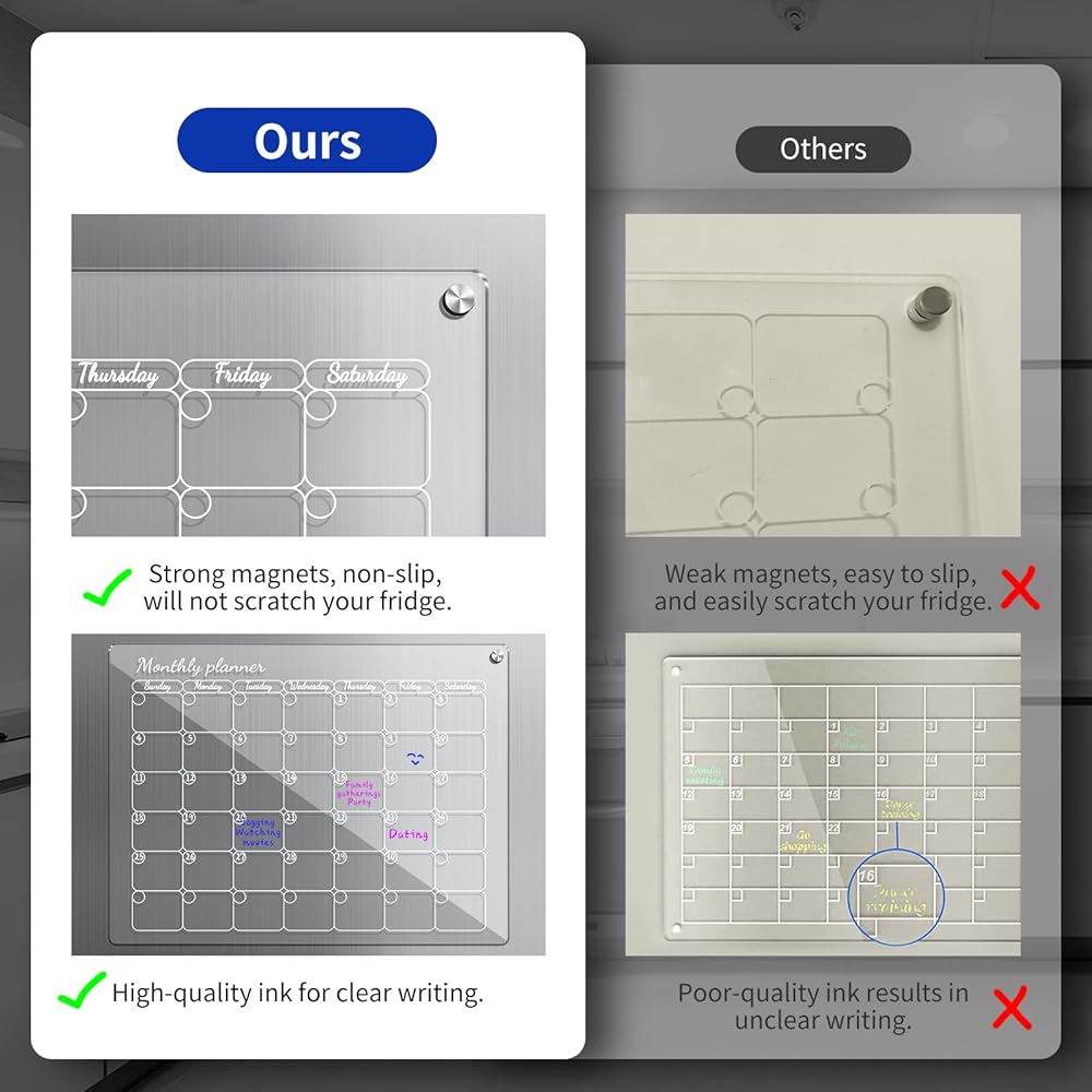 [Anti-scratch & Anti-slip] 4 strong magnets come with soft, anti-slip silicone covers, and the edges of the calendar board are polished, so they won't slip off, not to mention scratch your hands and fridge. Note: Please make sure the surface of your fridge can be magnetized by the magnet before purchase.