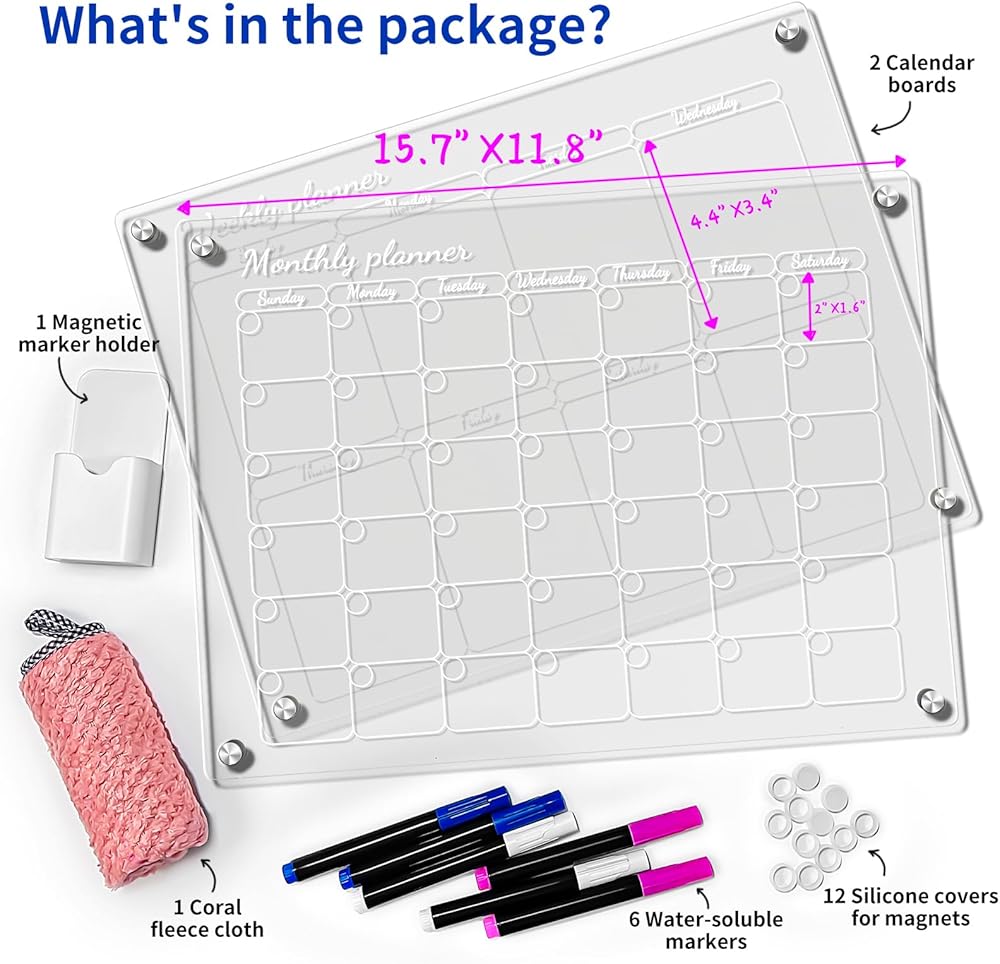 [What's in the package] 2 calendar boards (1 monthly & 1 weekly), 6 markers (2 blue, 2 white, and 2 rose), 1 magnetic marker holder, 1 coral fleece cloth, 12 silicone covers, and 1 user manual.