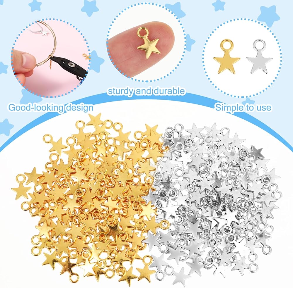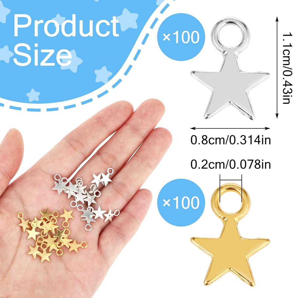 • 【200PCS Star Charms Pendants】You will receive 200 star charms in total, 2 styles of 100 gold and 100 silver Alloy Pendants. Each star charm is approximately 1.1x0.8x0.1cm/0.43x0.314x0.039in. Small, exquisite, delicate, and practical.