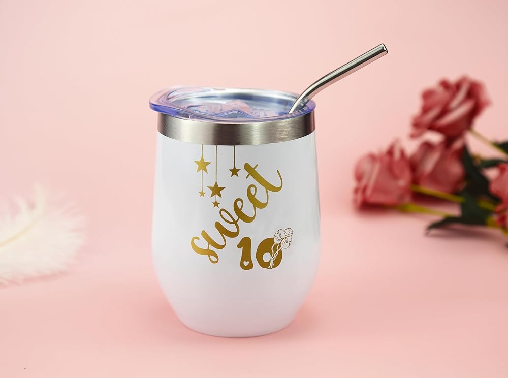 【العاشر من الزجاج الحصري للبنات الحصرية】 اشرب كوبًا من النبيذ للاحتفال بعيد ميلاده العاشر ، والتقاط صورة جماعية مع البهلوان للاحتفال بعيد ميلاد خاص 10. يتكون البهلوان من مواد عزل مزدوجة الطبقة وتصميم عزل النحاس الساخن ، "10 و Sweet" المختوم على القدح ، إنه الحجم الصحيح للنبيذ الأحمر والقهوة أو الكوك أو الشمبانيا أو الشاي أو العصير ، ويأتي مع قش وفرشاة تنظيف!