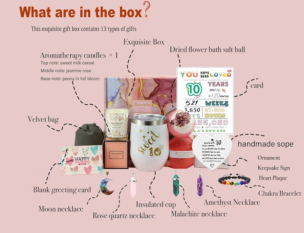 【هدية عيد الميلاد العاشرة الحلوة】 يا إلهي ، تبلغ من العمر 10 سنوات ، هذه هي سلة الهدايا المخصصة لدينا لنساء تبلغ من العمر 10 سنوات. يتم اختيار كل هدية في الداخل وتصميمها بعناية من قبل المصمم. من فضلك أعطها لها في ليلة جميلة ورومانسية. دهشها مع صندوق الهدايا المخطط لها بعناية ، والتعبير عن حبك وأطيب التمنيات لها ، ومنحها عناقًا كبيرًا