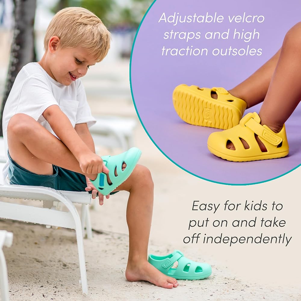 • EASY ON + SECURE FIT - Our toddler water shoes are designed with an adjustable hook and loop strap, a sturdy heel cup, and a closed toebox. These versatile boys and girls sandals make a great shoe both for the pool and the summer camp