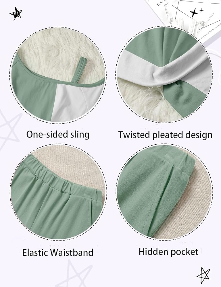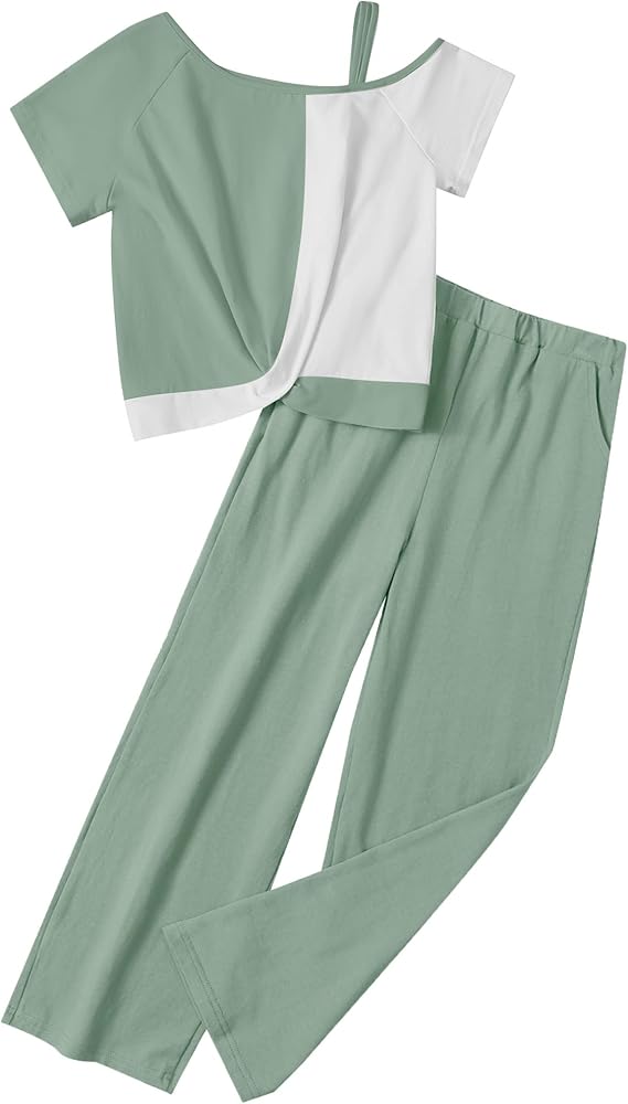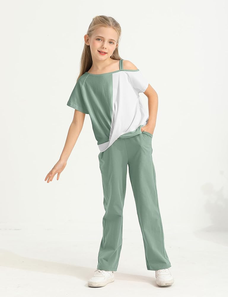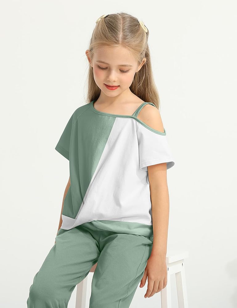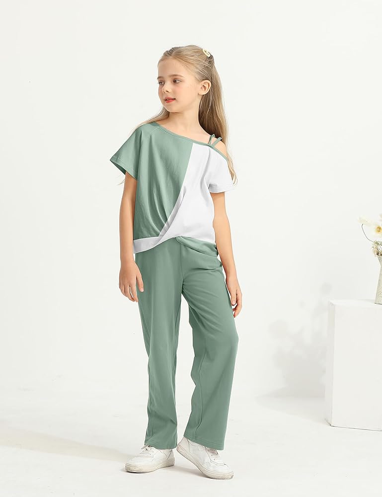 تصميم الأزياء: تتميز ملابس الفتاة الخضراء الفاتحة برقبة مستديرة كلاسيكية ومجموعة فريدة من نوعها ملونة بلوك فريدة من نوعها لتصميم أعلى الكتف البارد ، مما يجعلها عصرية وأنيقة ، تتميز السراويل الواسعة بخصر مرن لملاءمة مريحة ومثالية لجميع الفتيات