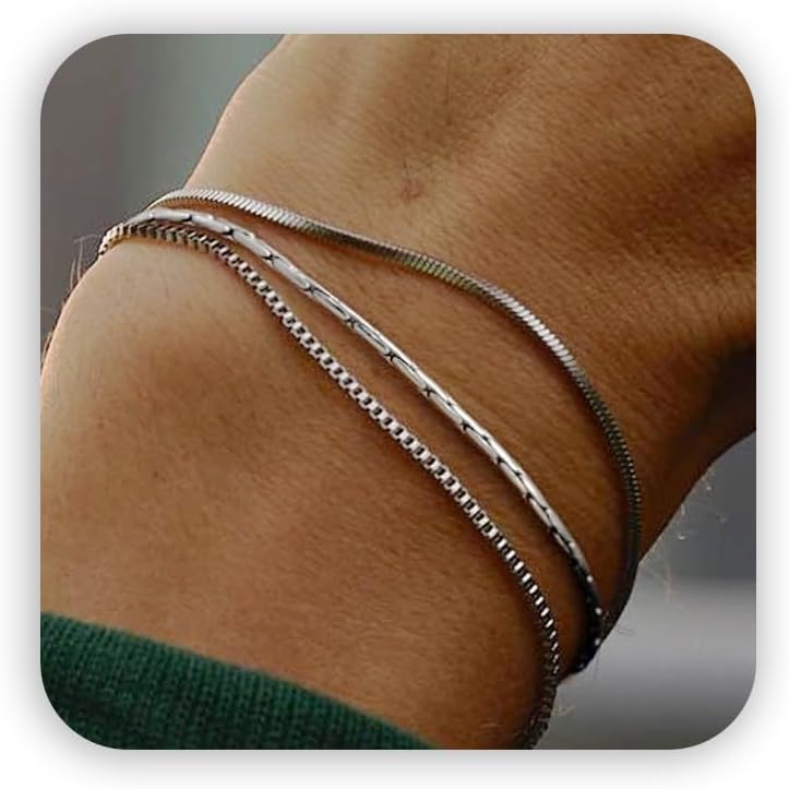 Men's Silver Bracelet Set: 3 PCS Tiny Snake Chain Link Bracelets Non Tarnish Stainless Steel Jewelry for Men Women 6.5/7/7.5/8/8.8/9 Inch Cool Silver Stack Bracelet Gifts for Boyfriend or Dad