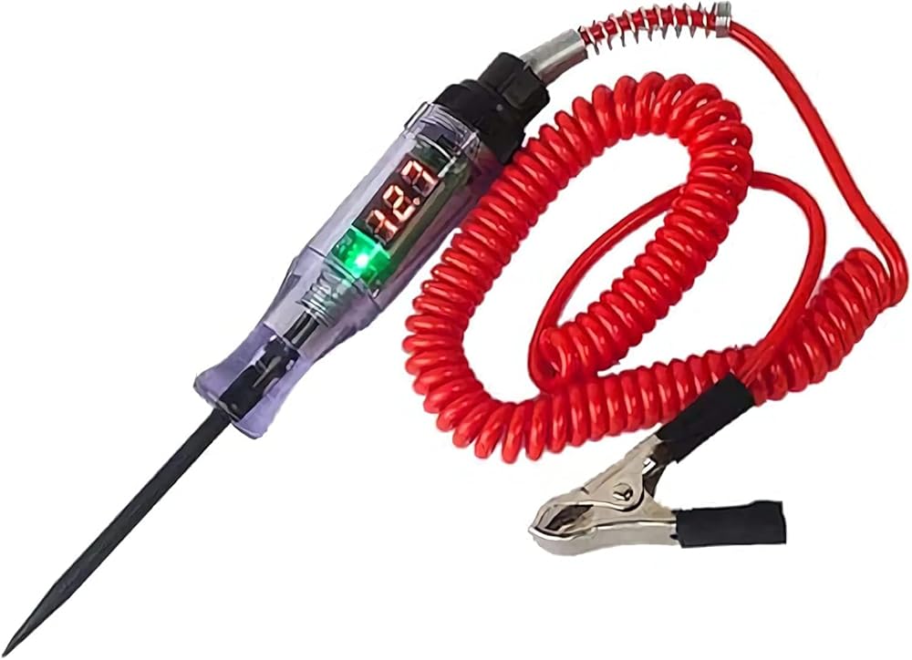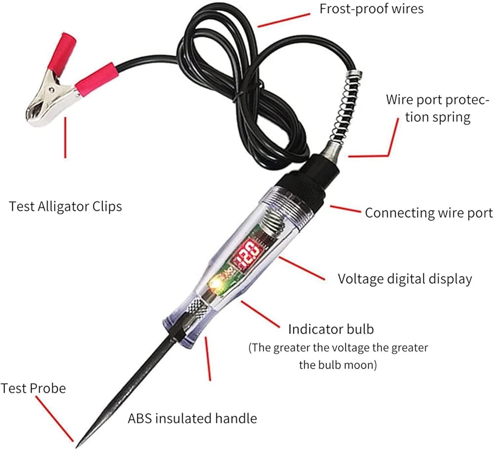 قلم اختبار دائرة شاحنة السيارة، قلم المسبار هذا مثالي لفحص الدوائر والصمامات والمفاتيح والأسلاك في السيارات والمقطورات والقوارب والدراجات النارية وغيرها من أنظمة الجهد المنخفض. قم بتوصيل مشبك التمساح بالأرض، ثم خذ المسبار لاختبار الدائرة. إذا كان ضوء المؤشر قيد التشغيل، فهناك كهرباء.