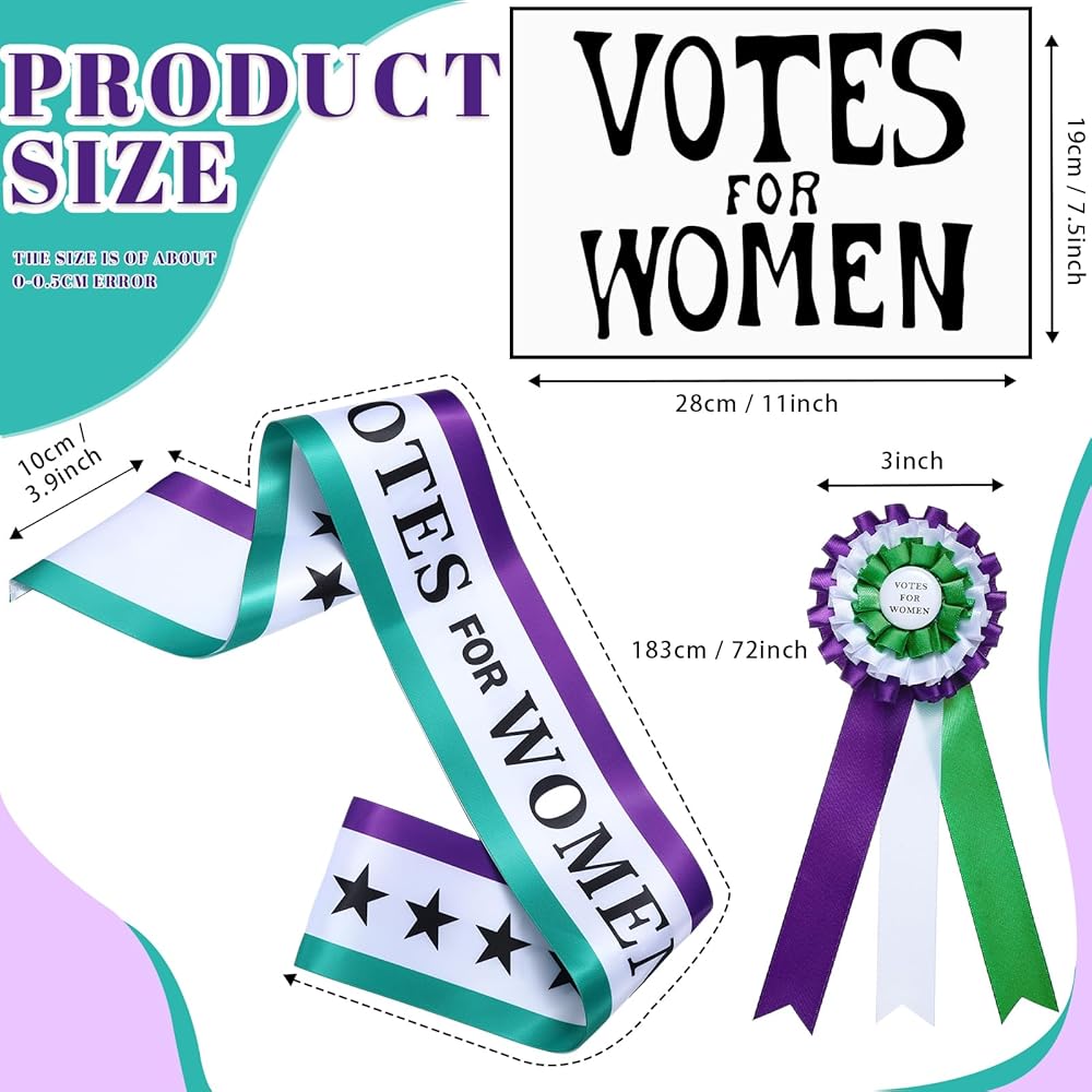 Product Includes: you will receive three Victorian suffragette clothing sets, including a 72-inch ribbon, a 3-inch wide ribbon brooch, and an 11x7.5-inch Vote for a Woman handheld card