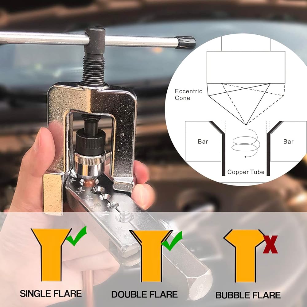 ✔【Multifunctional】The flaring tool with the chrome-plated flaring cone is made of heat-treated steel material, and the swivel joint is made of alloy steel and chrome-plated to help reduce friction so that you can get maximum strength and long service life. The heavy-duty yoke is forged from heat-treated steel and has durability and strength. This type of flaring tool can produce double or single flaring at 45 degrees.