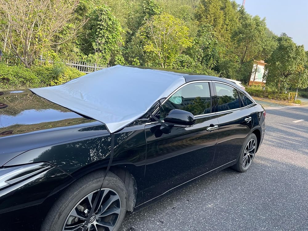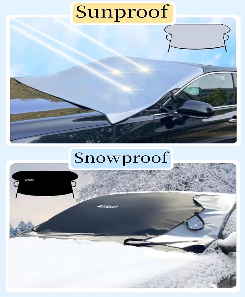 [Dual-Sided Design for Year-Round Use] Say goodbye to seasonal windshield woes! The silver reflective side is perfect for shielding your car from the summer heat, while the black side efficiently prevents ice and snow build-up during winter. Enjoy a windshield cover designed to adapt to every season.