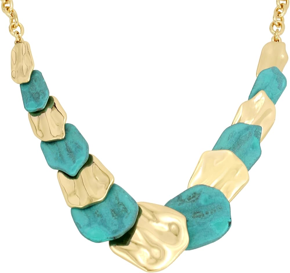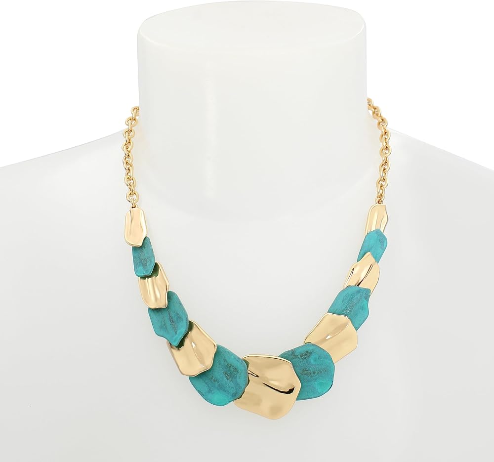 Refined chain necklace featuring sculpted layered petals at front in textured turquoise patina and gold-tone finish. Necklace has an adjustable lobster clasp closure. Made from metal.