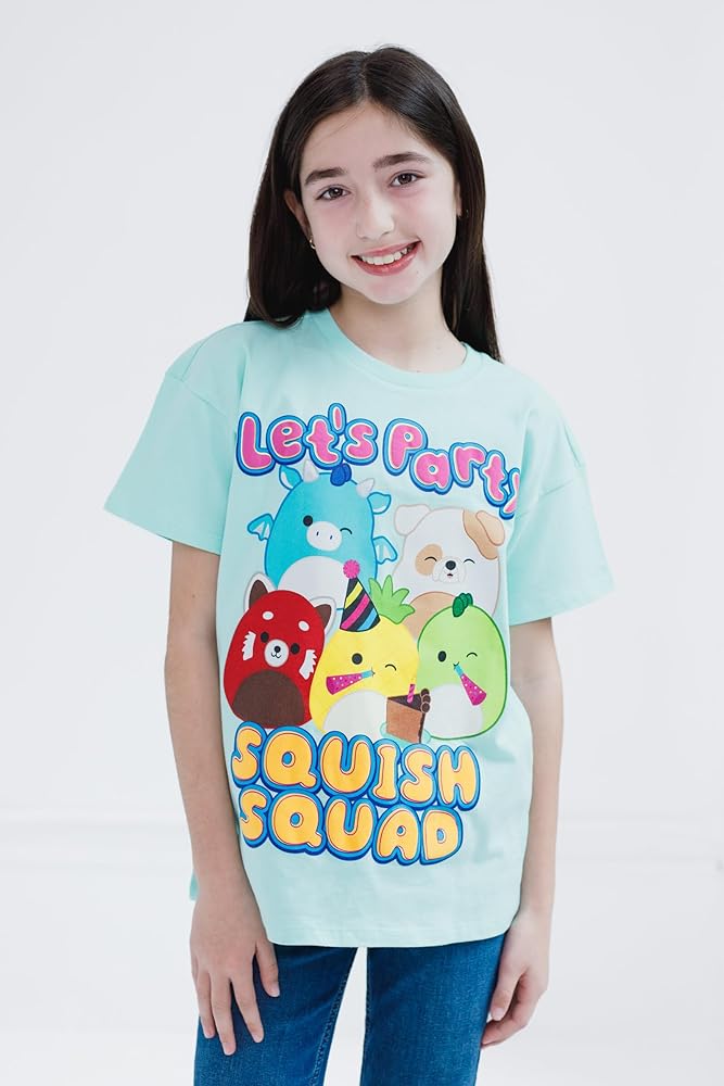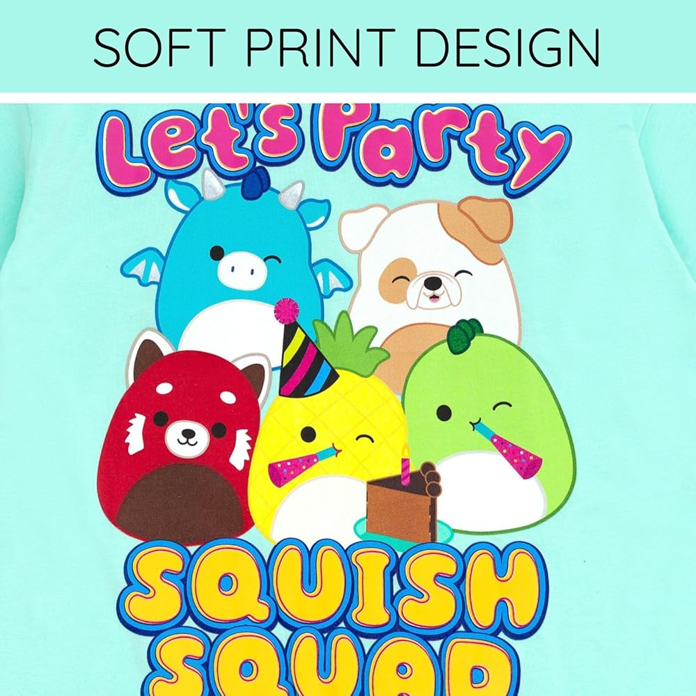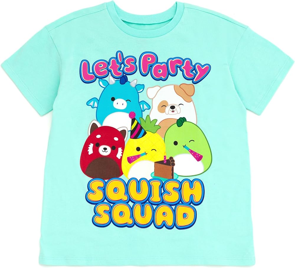 Celebrate with your kid's favorite plush stuffed animals in this cute and comfy Squishmallow birthday shirt! This stylish short sleeve tee features a fashionable drop shoulder design and vibrant and colorful artwork of cute Squishmallows with the words "Let's Party Squish Squad!" Dressed in this soft and comfortable Squishmallows tshirt, your child is ready for a fun birthday adventure!