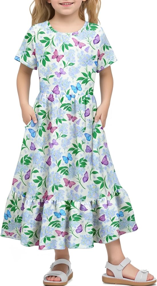 ميزات التصميم - فساتين الفتيات الصيفية Maxi مع تصميم مستأجر متراوح ثنائية ، واثنين من الجيوب الجانبية. أيضا مزيج من Crewneck ، Skater Skater Long Sundress مع الأكمام القصيرة الكشكش سوف يجلب فتاتك الصغيرة المألوف والنعمة