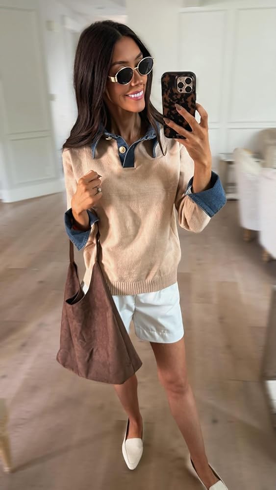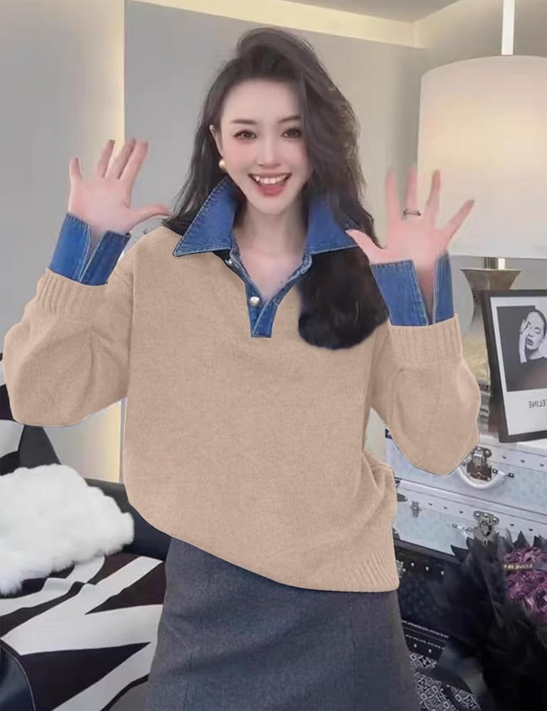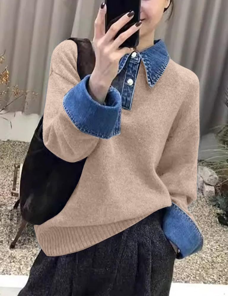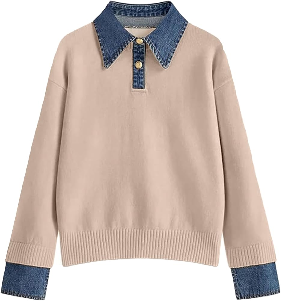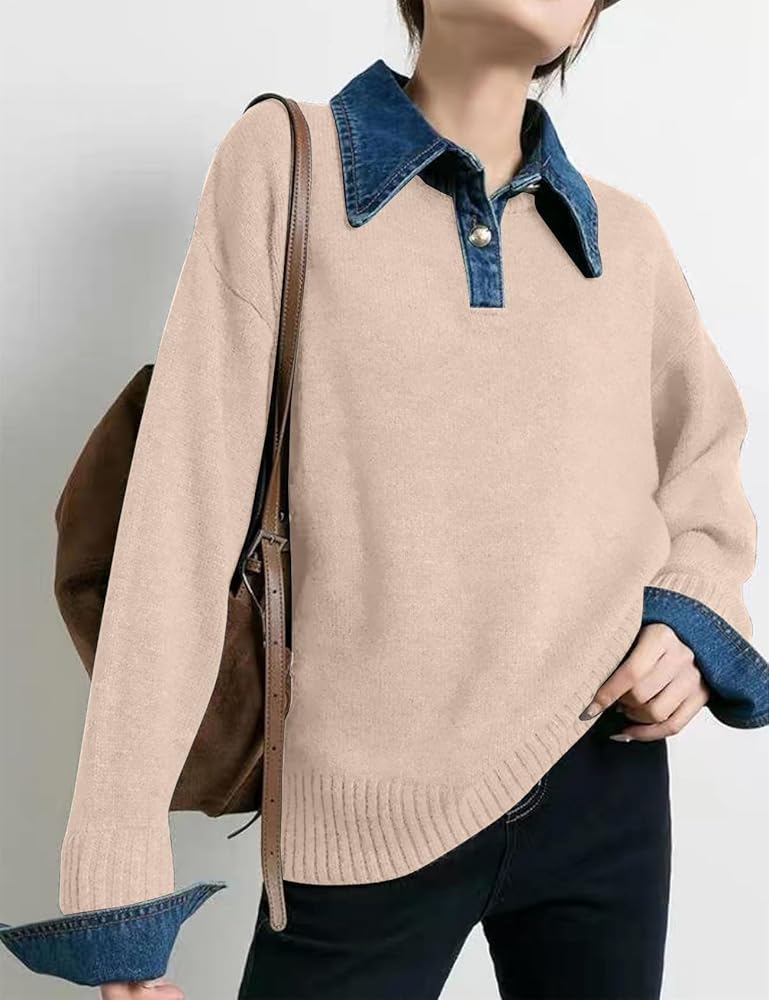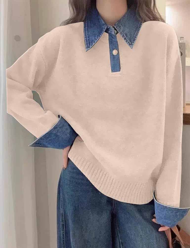 Features: knit sweater with denim button down polo collar, 2 metal buttons, long sleeves, dropped shoulders, loose fit, solid color, denim panel, ribbed knit, medium stretch, lightweight and stretchy fabric