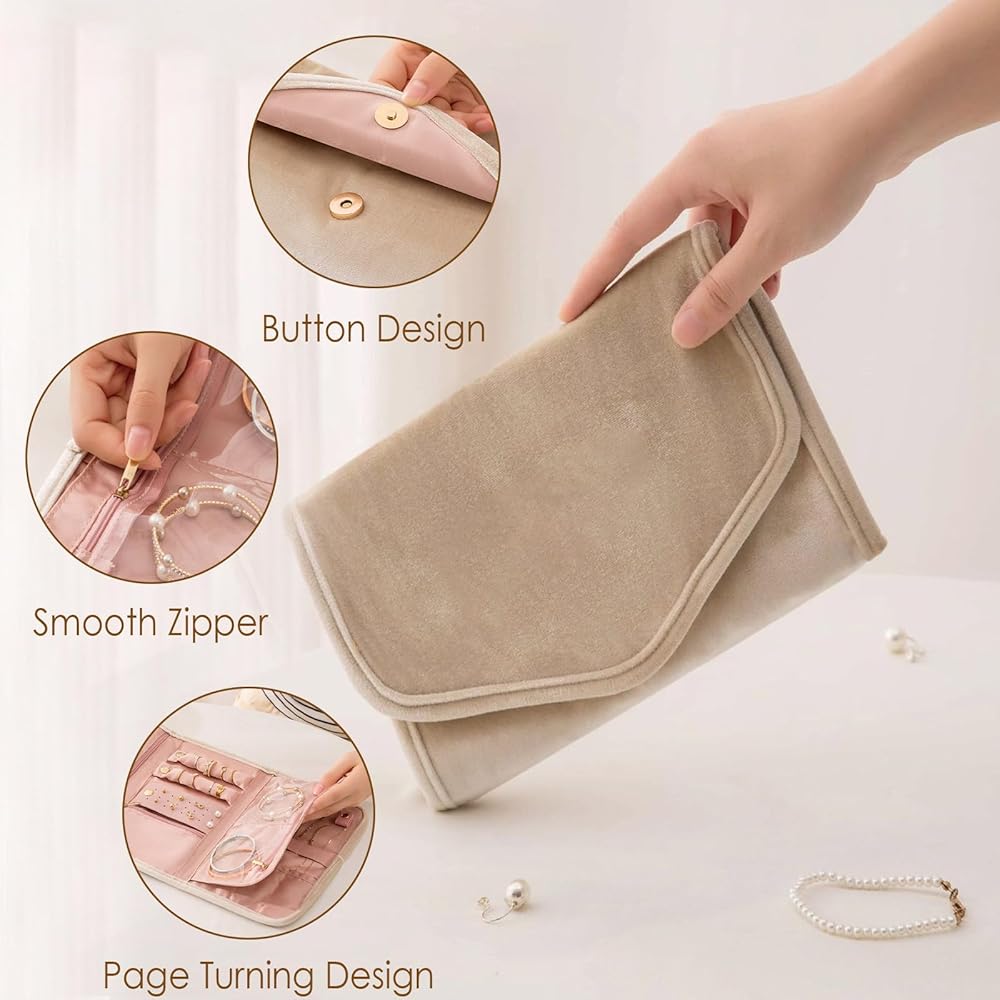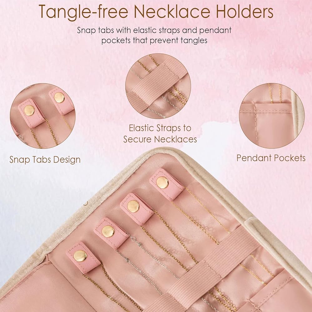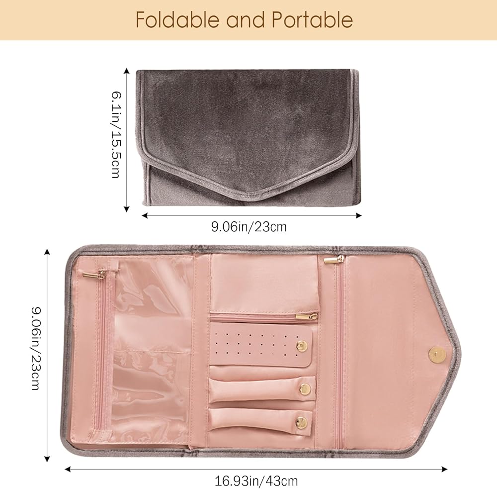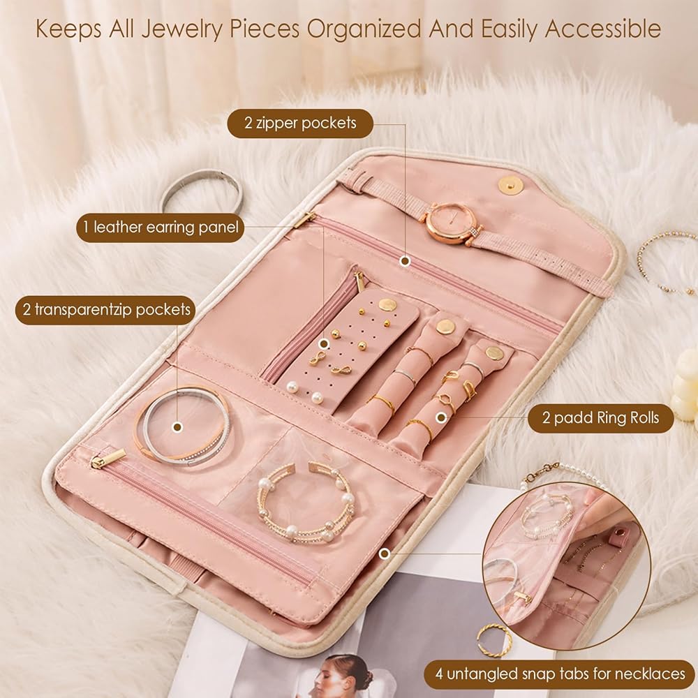 Thoughtful Organization with 5 Sections:Designed for efficiency, it features a ring buckle strap, earring panel, necklace buckle strap, a visible zippered pocket, and a long zip pocket—keeping your jewelry tangle-free and neatly arranged.