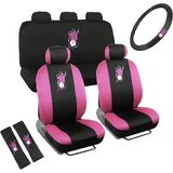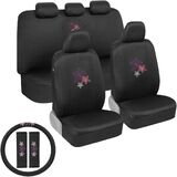 BDK Pink Flowers Car Seat Covers Full Set with Steering Wheel Cover and Seat Belt Pads – Front and Rear Covers with Matching Embroidered Accessories, Universal Fit for Cars Trucks Vans SUVs