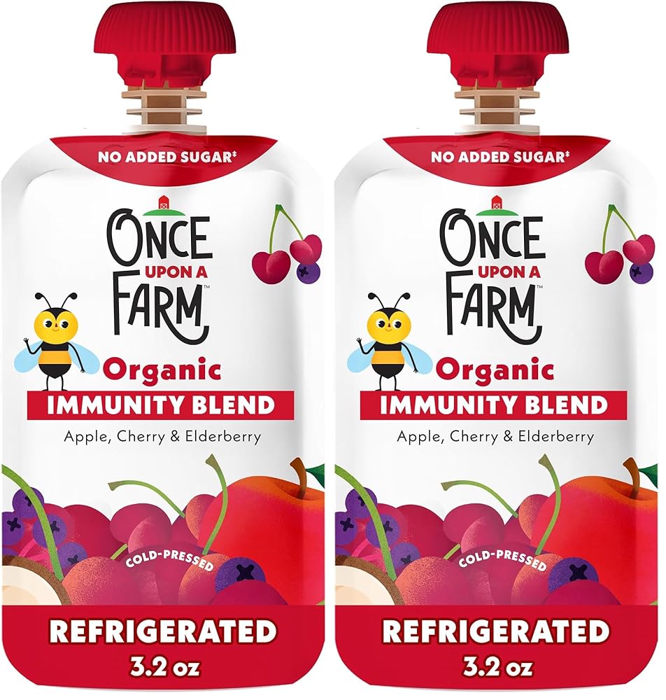 Apple, Elderberry and Cherry, plus added probiotics, which help to support immune health+. Proud recipient of The Clean Label Project verification and Purity Award Certification, making us best-in-class in the category. Designed for kids, but suitable for ages 12+ months. At Once Upon a Farm, a better story starts here. Our organic recipes are crafted with only the best ingredients – whole fruits and veggies that are picked, blended and cold-pressed to lock in nutrients, taste and texture. Each of our non-GMO, non-dairy fruit & veggie blends and smoothies have no added sugar‡, and are free from artificial flavors, colors and preservatives – just simple, real, nutrient-packed kids snacks your family will love. † When paired with a healthy diet and active lifestyle. ‡Not a low calorie food.