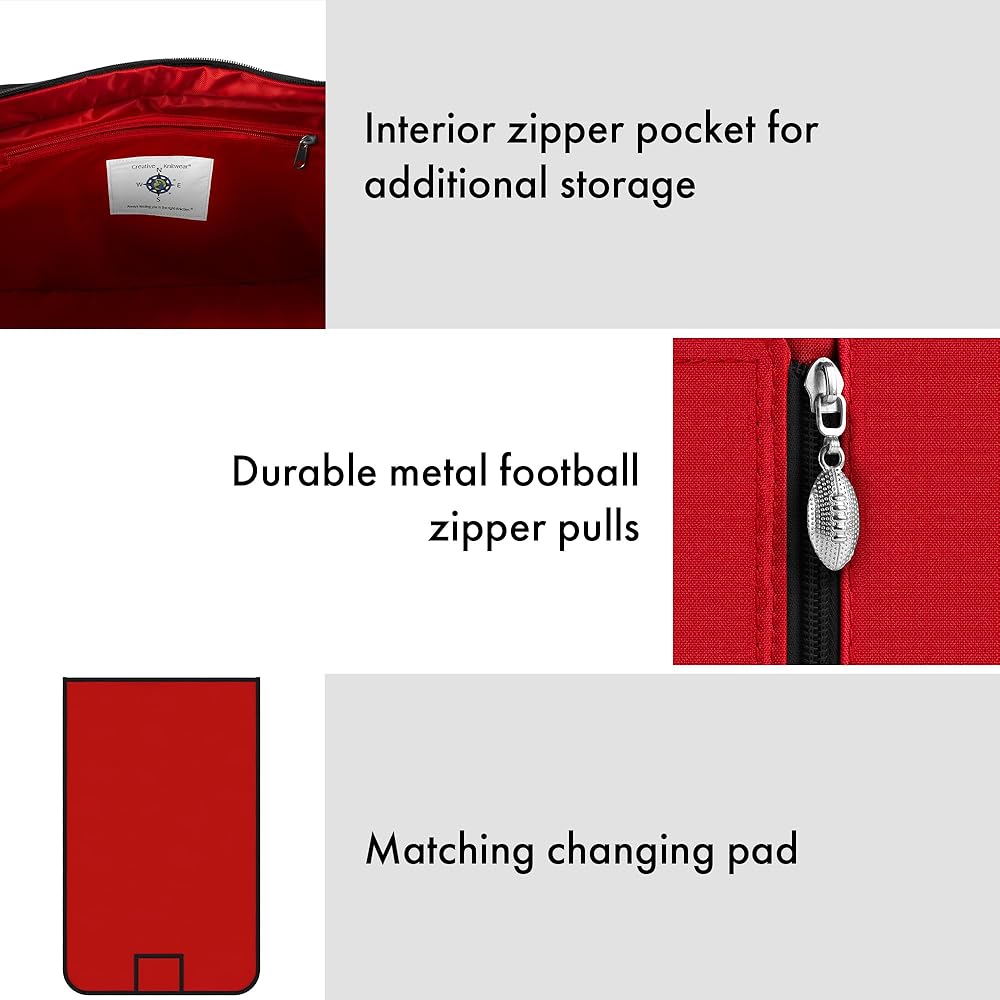 Stay organized and stylish on the go with this functional diaper bag, designed for busy moms, dads, and babies. Featuring football zipper pulls, a top zipper closure, and plenty of pockets, this washable bag keeps essentials within reach. Includes an extra-large embroidered changing pad and is adorned in team colors. Available with basketball, hockey, and lacrosse zipper pulls. Officially licensed - featuring team embroidery.
