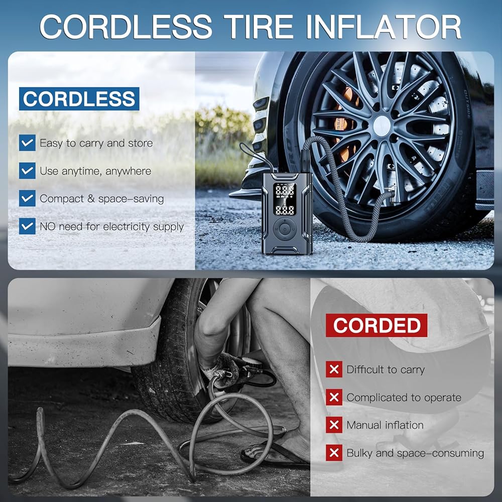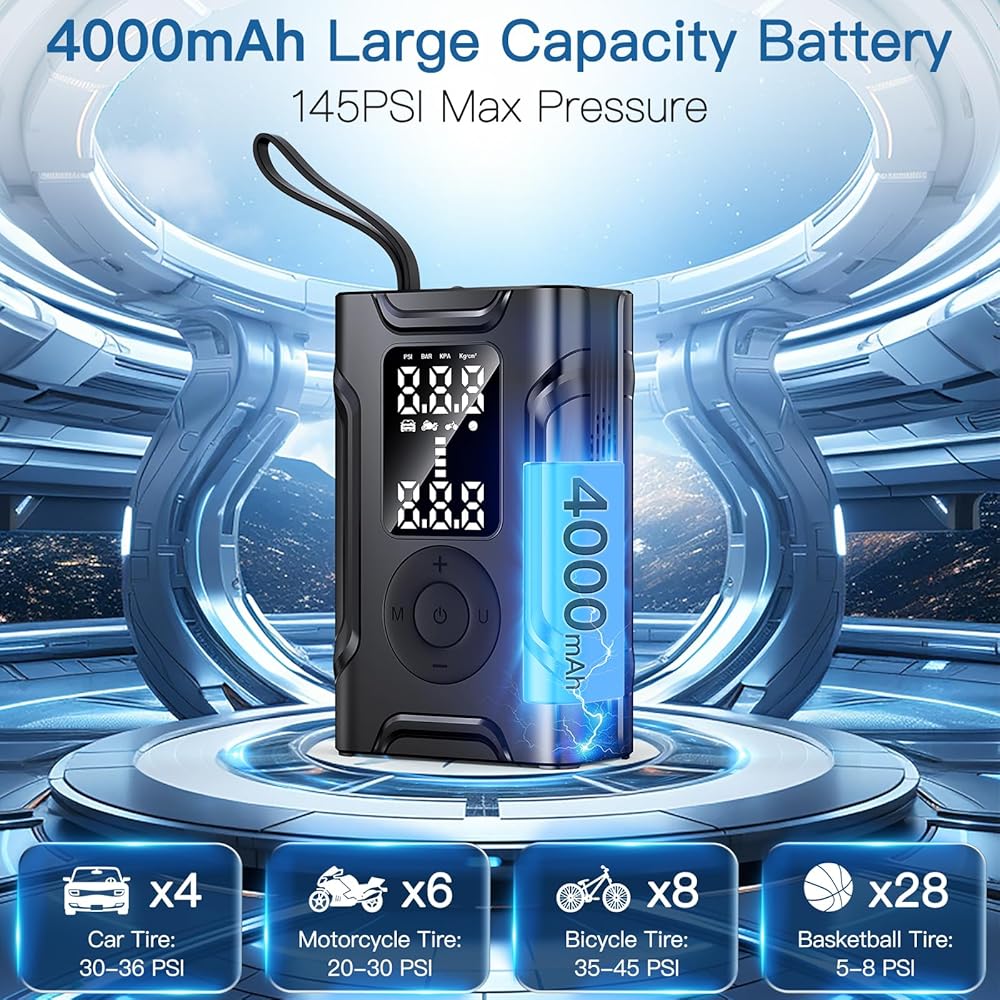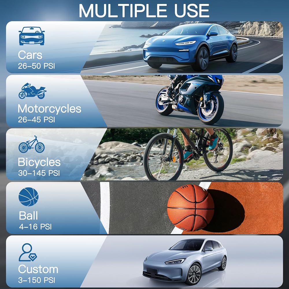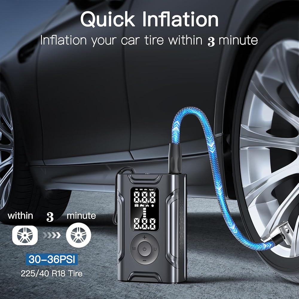التضخم السريع فائق ، وأسرع. يبلغ ارتفاع ضغط الإطارات هذا الإطارات أقصى قدر من ضغط الهواء قدره 145psi ، والذي يمكن أن يؤدي إلى تضخيم إطار سيارتك في غضون 3 دقائق ، وهو مثالي للسفر الطويل والرحلات على الطرق. ويمكن أن يؤدي هذا النجمة المحمولة إلى تضخيم ما يصل إلى 4 إطارات للسيارات ، أو 6 إطارات للدراجات النارية ، أو 8 إطارات للدراجات ، أو 28 كرة سلة ، بما يكفي للاحتياجات العادية.