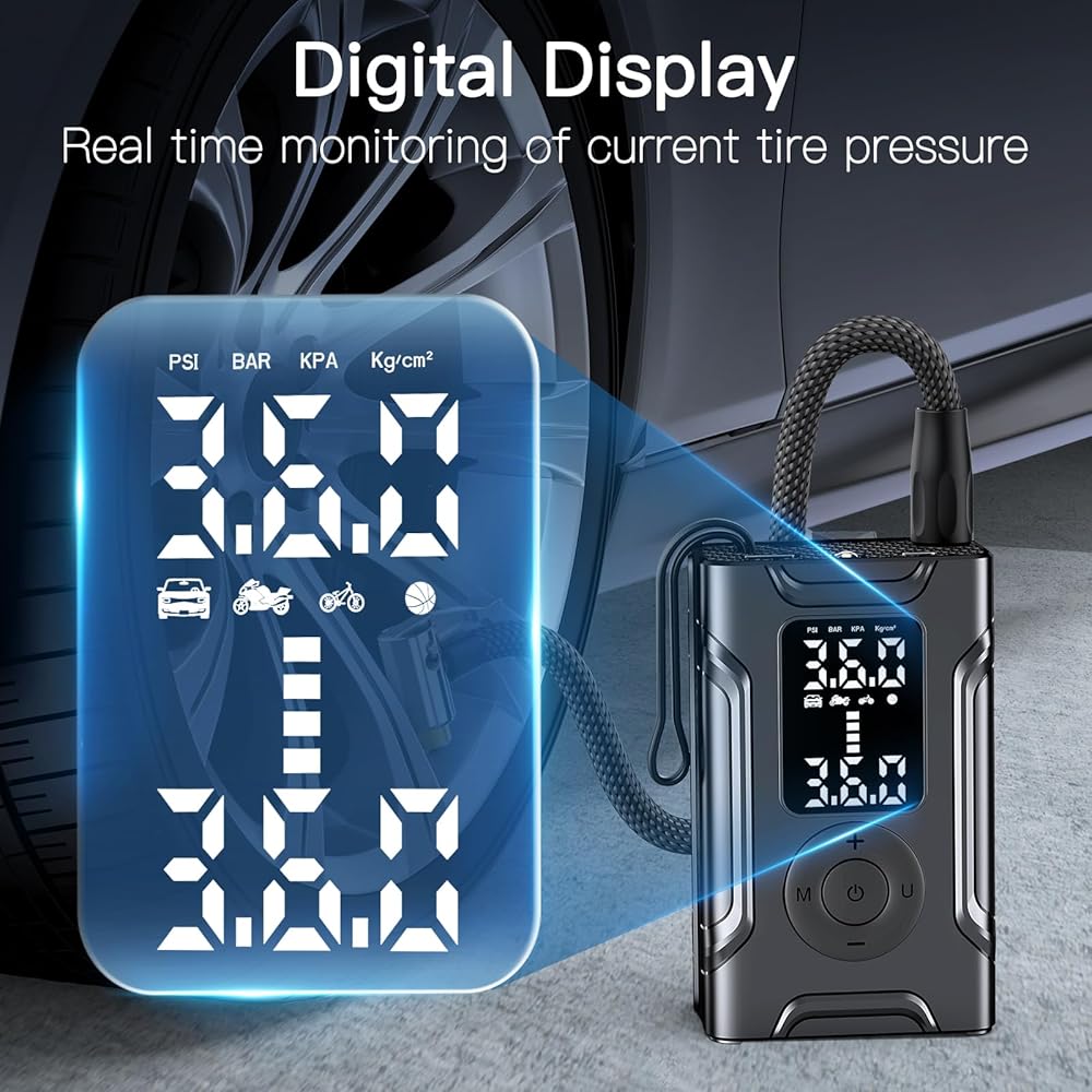 العرض الرقمي في الوقت الحقيقي والتوقف التلقائي ، تحرير يديك. تأتي مضخة التضخم المحمولة هذه مع شاشة عرض LED تتيح لك مراقبة عملية التضخم في الوقت الفعلي. ويتضمن هذا التضخمة وظيفة إيقاف تشغيل تلقائي ، بعد الوصول إلى قيمة الضغط المسبق الخاص بك ، سيتوقف نفخ الإطارات تلقائيًا ، آمنًا وخاليًا من القلق.