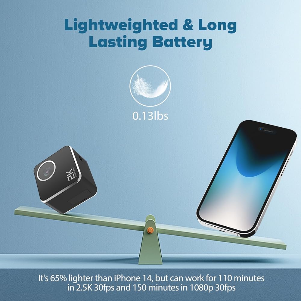 خفيفة الوزن ولكنها فترة زمنية طويلة: 60 جرام فقط مع حجم صغير ، ولكن يمكن أن تعمل كاميرا الجسم الصغيرة لمدة 110 دقيقة في 2.5 كيلو و 150 دقيقة في وضع الطاقة المنخفضة عندما تكون مشحونة كاملة. تجعلك تستمتع بوقت التسجيل الخاص بك ولا تقلق بشأن سعة البطارية.