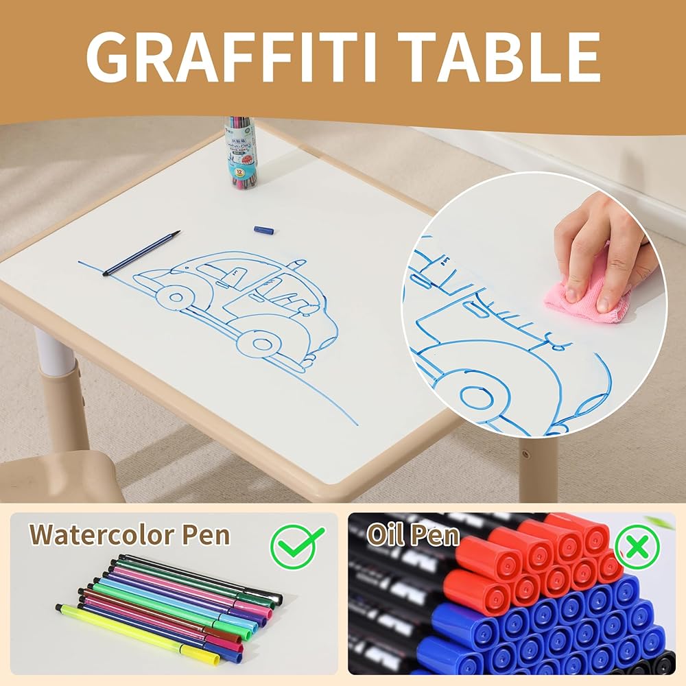 【MULTIFUNCTIONAL KIDS TABLE SET】Perfect for toddlers and preschoolers, this kids table is the perfect "all-in-one" place to enjoy meals and snacks, engage in arts and crafts, play with their best pals, and have fun time. Moreover, the desktop is very easy to clean, and stains from water-based brushes can be easily erased.