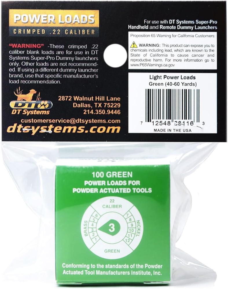 للاستخدام مع Super Pro Dummy Launcher - هذه الأحمال الكهربائية الفارغة من عيار 22 مخصصة للاستخدام مع قاذفات DT Super -Pro Dummy فقط. لا تستخدم أحمال العلامة التجارية الأخرى على قاذفات DT Super Pro Dummy. لا ينصح بالأحمال الحمراء لأنها قد تتلف قاذفة وهمية ودمية