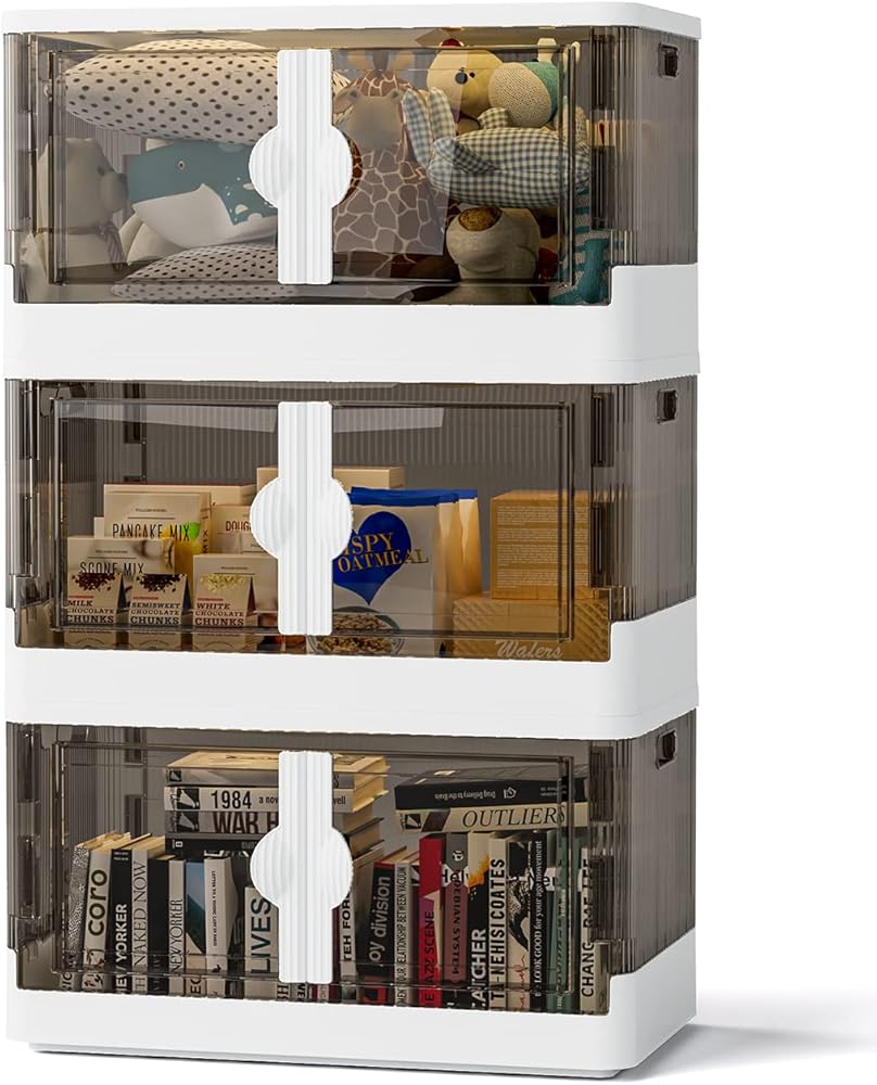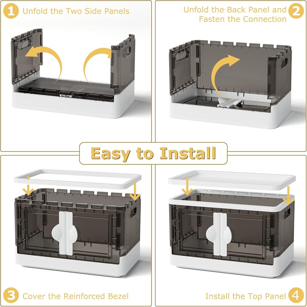 【التثبيت والطي بسهولة】- يمكن طي صناديق التخزين القابلة للطي والقابلة للتكديس مع غطاء علوي وباب مفتوح جانبيًا بشكل مسطح عند عدم استخدامها لتوفير المساحة. يمكنك فتح أو طي صندوق التخزين البلاستيكي بشكل مسطح في ثوانٍ، ما عليك سوى رفع 4 ألواح وربطها معًا وتغطية الغطاء العلوي.