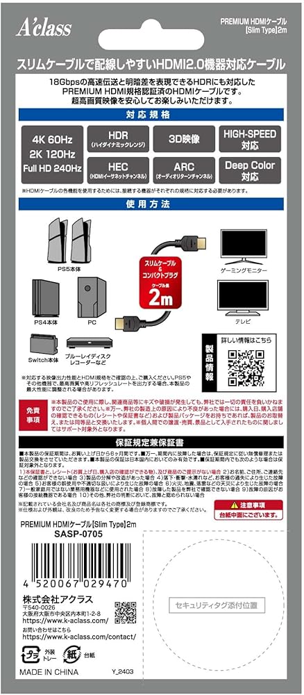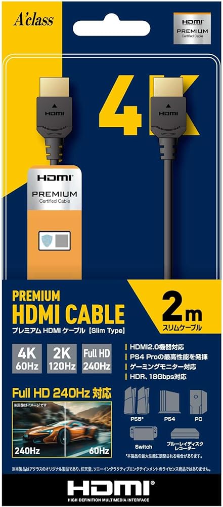 ■ Set Includes: 1 x Premium HDMI Cable ■ Cable Length: 6.6 ft (2 m) ■ Compatible Models: PS5/PS4/Switch/Gaming PC/Other devices with HDMI connection. *It is not compatible with the highest output of PS5. ■ Supported Standards: HDMI 2.0 ■ Supported Functions: Transmission speed 18Gbps, 4K 60Hz, 2K 120Hz, HDR support