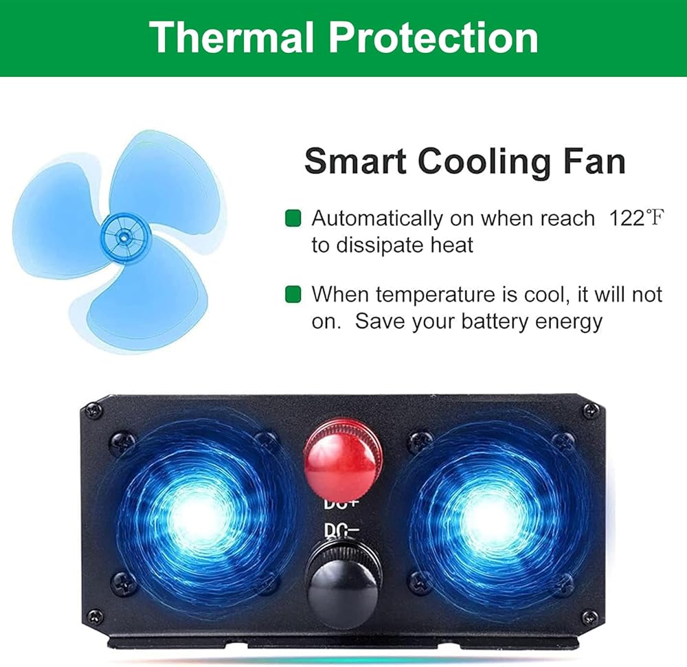 【مروحة التبريد】 مع التحكم في درجة الحرارة الذكية ، فإن مروحة التبريد المنشطة المدمجة ذات الصلة الفائقة الصامتة تبقي العاكس يعمل بشكل صحيح وهدوء. يمنع الإسكان الألمنيوم من الدرجة الطيران التشوه مع توفير تبديد إضافي للحرارة لإطالة عمر العاكس.