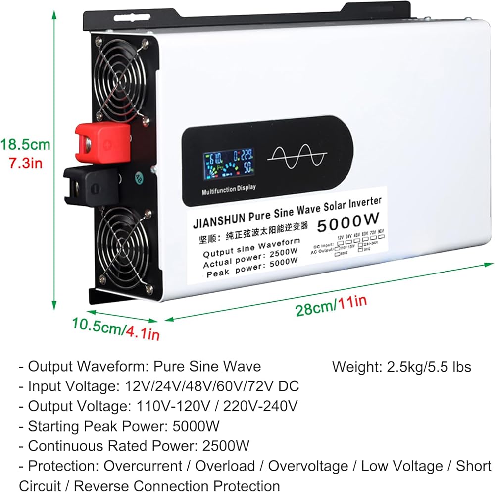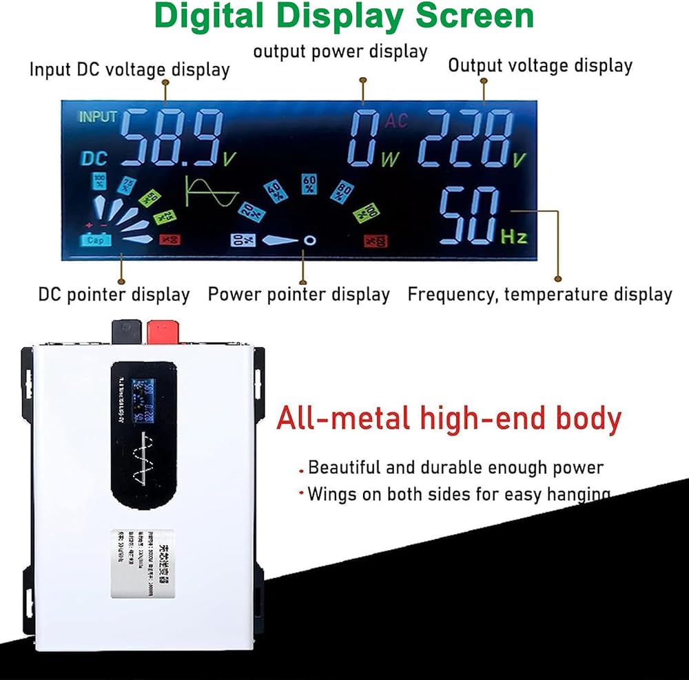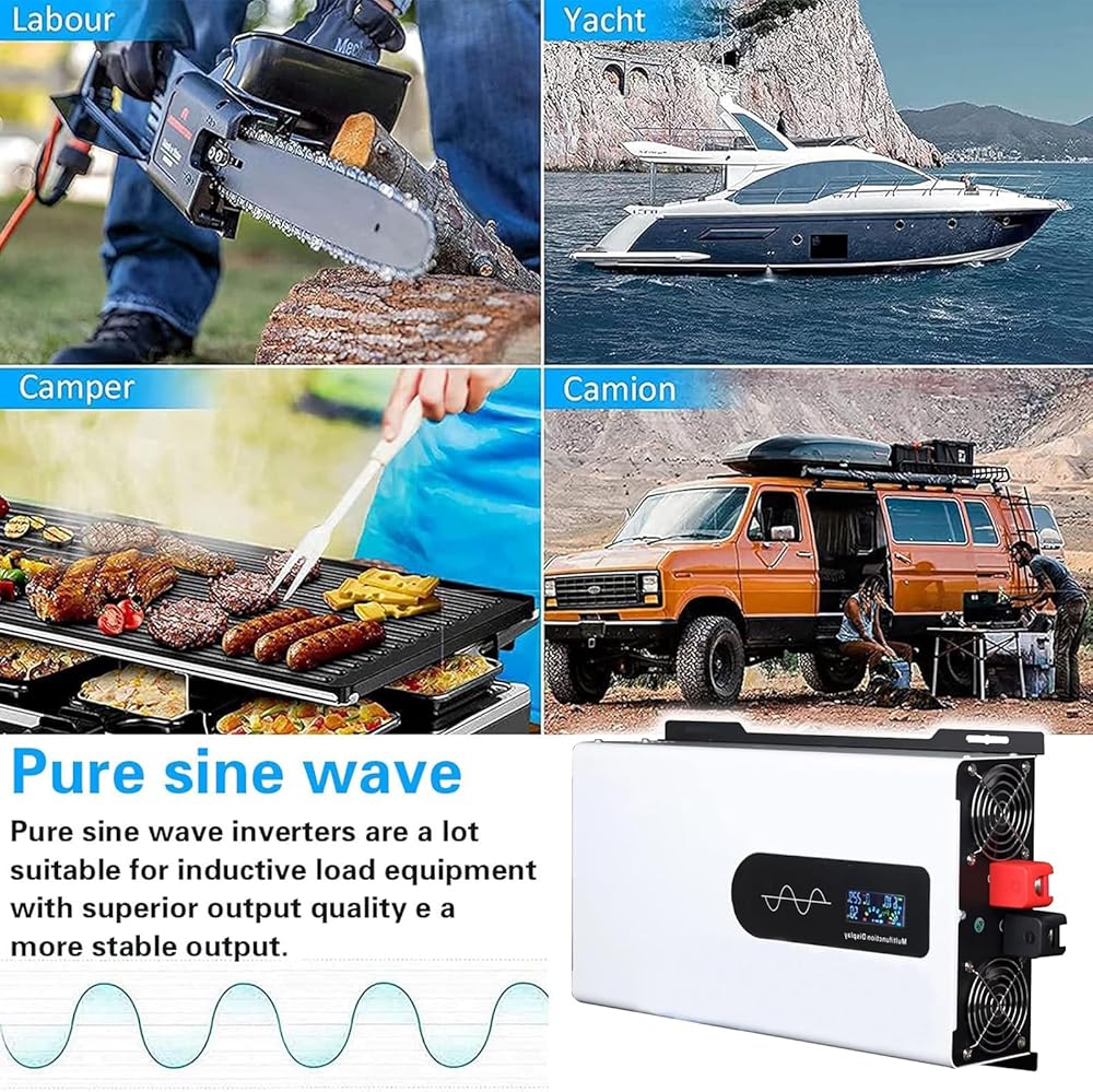 【شاشة عرض LCD】 يمكن لشاشة عرض LCD أن تعرض حالة الاستخدام في الوقت الفعلي (مثل درجة حرارة العمل ، وحالة البطارية ، وجهد الإخراج ، وجهد الإدخال ، وطاقة الجهاز المستخدمة ، وأسباب حماية المحول) ، مما يجعل من السهل تتبع الاستخدام. ما عليك سوى توصيل نظام البطارية 12 فولت/24V/48V/60V/72V لتشغيل الجهاز في المنزل أو في الهواء الطلق للتعامل مع حالات الطوارئ والأعاصير والعواصف وانقطاع التيار الكهربائي ، ومناسبة للربع الوطني ، وقوارب القوارب ، وعمل التخييم.