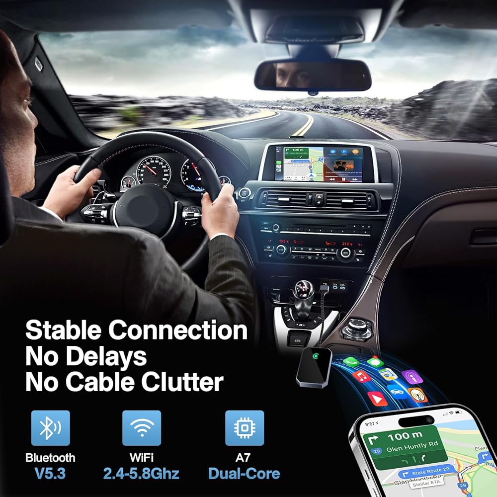 【Extremely Efficient A7 Intelligent Chip】Buit-in A7 Chip With 5.8 GHZ WiFi, 5.3 Bluetooth and 8-core genius processor for Android Auto which makes data transmission rate by up 40%+, transfer Google Maps, media and messaging apps to your in-car display up to 10 times faster than others. Unique A7 chip keeps excellent performance in Anti-Oxidant, hardness, corrosion, and Temperature tests (-20°C to 70°C). No worry about disconnect during a long driving