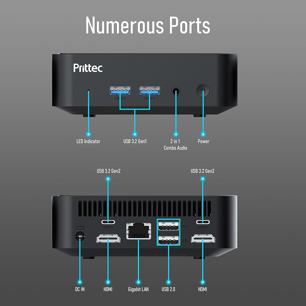 【Mini PC N100 ، RAM 16GB و 512GB SSD】 Prittec F8C لديه ذاكرة RAM 16GB DDR4 مدمجة و 512 جيجابايت M.2 SSD. من المفترض أن يكون SSD 512 جيجابايت M.2 كافيًا للمهام اليومية. يمكنك الترقية عن طريق استبدال SSD بحد أقصى 2 تيرابايت لتوسيع التخزين ، والذي يمكنه تخزين كميات كبيرة من البيانات والملفات.