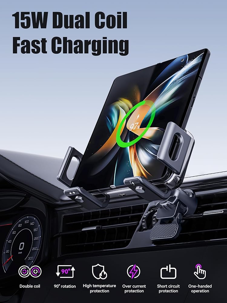 MOSHOU Wireless Car Charger Z Fold Flip Auto Clamping Car Mount 15W Fast Charging Air Vent Car FIt for Samsung Z Fold 6/5/4 Flip 6/5/4 iPhone 16/15/14/13/12/11/X