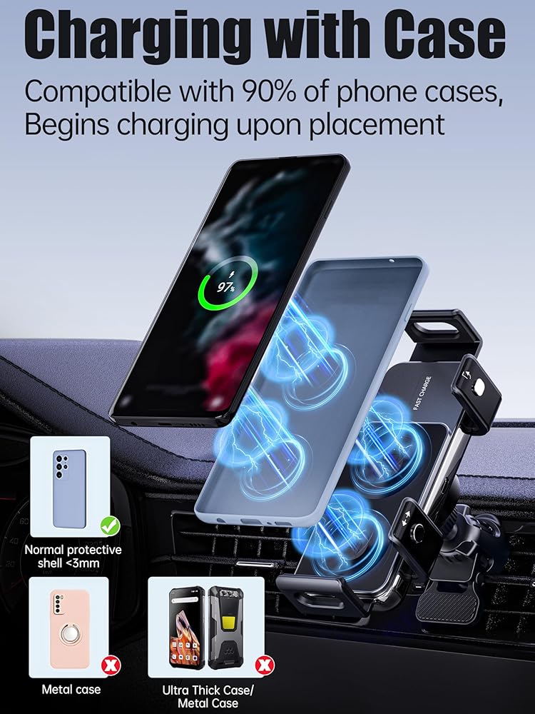 【Case-Friendly Design & 360° Adjustable Viewing Angles】 No need to remove your phone case! This car mount supports wireless charging through cases up to 6mm thick, making it compatible with most protective covers. (Note: Metal cases, magnetic attachments, and credit cards may interfere with charging) The 360° rotating ball head and foldable bracket allow you to adjust the viewing angle to your preference, ensuring optimal visibility and a safer driving experience.