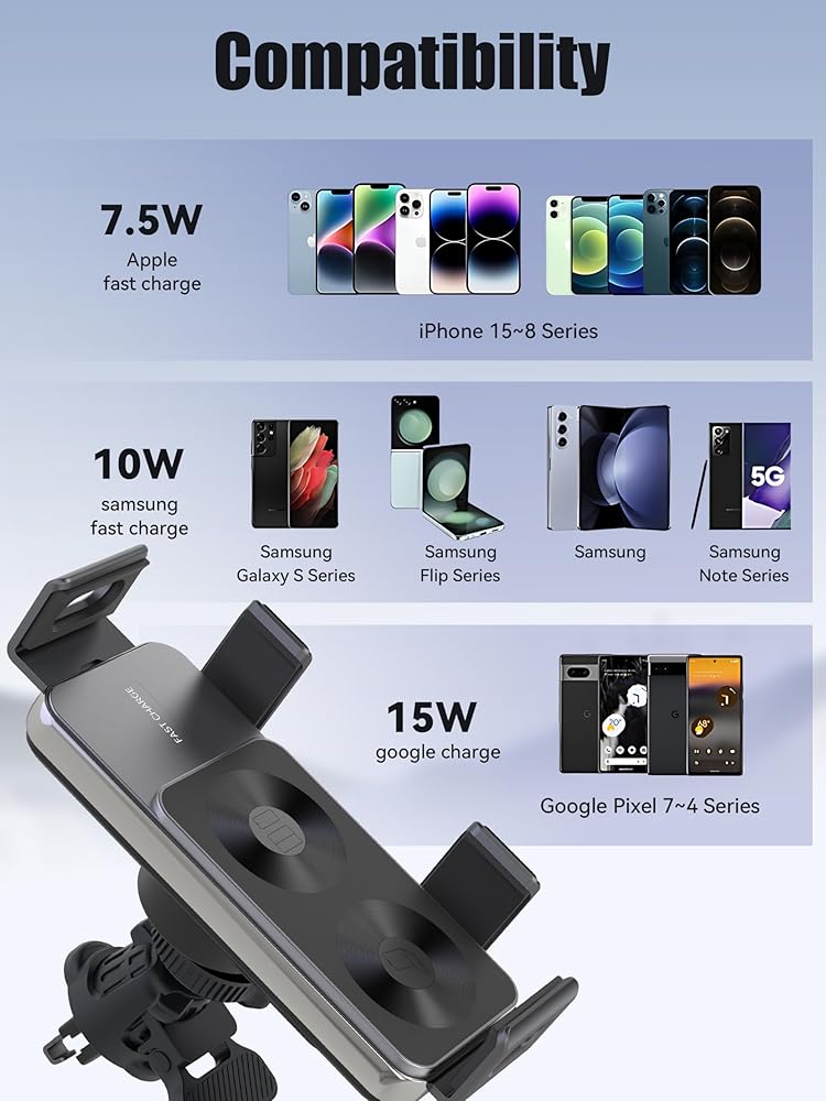 【15W Fast Wireless Charging – Power Up Your Device in Record Time】 Equipped with an upgraded MOSHOU chip, this car mount delivers lightning-fast wireless charging at up to 15W. It's compatible with a wide range of devices, including Samsung Z Fold/Z Flip, S24 Ultra/S23/S22/S21/Note series, Google Pixel, LG V60/V50/V40/V30+, and iPhone 16/15/14/13/12 Pro Max/11/XR/XS. Whether you're navigating, streaming, or taking calls, your device will stay powered up and ready to go.