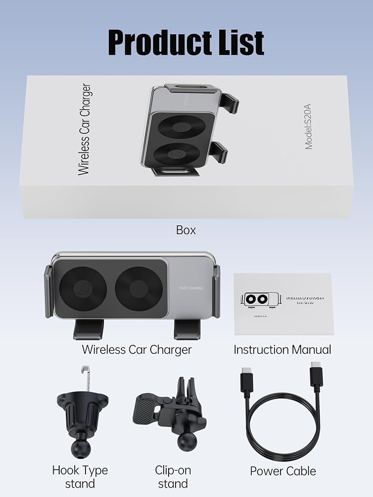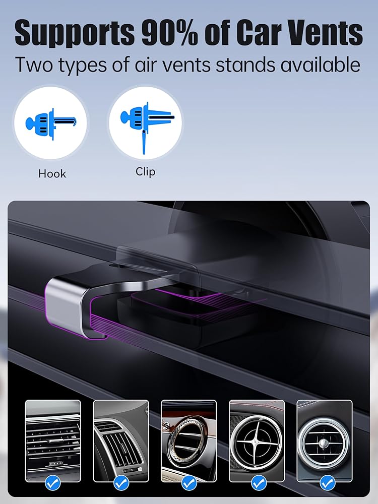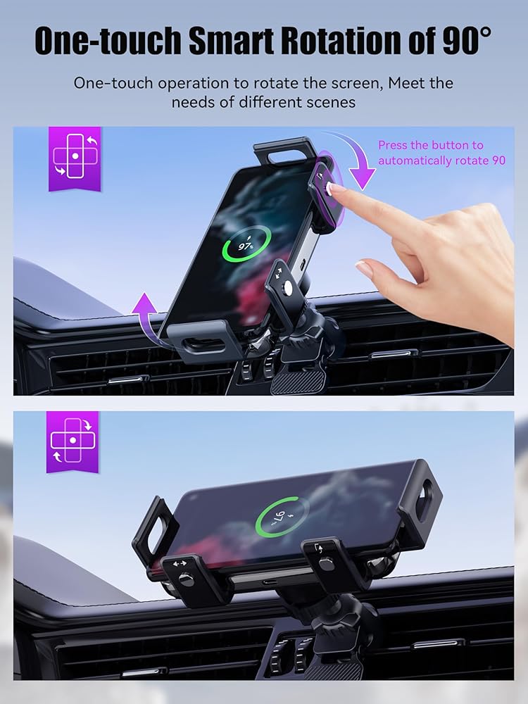 【Intelligent Auto-Clamping & Smart Charging Technology】 Say goodbye to fumbling with your phone while driving! Our car mount features intelligent auto-clamping technology that securely grips your device the moment you place it in the holder. With a simple touch of the side buttons, the arms open effortlessly for easy placement. Additionally, the built-in smart charging system automatically powers off when your phone reaches 100% battery, protecting your device from overcharging and extending its lifespan.