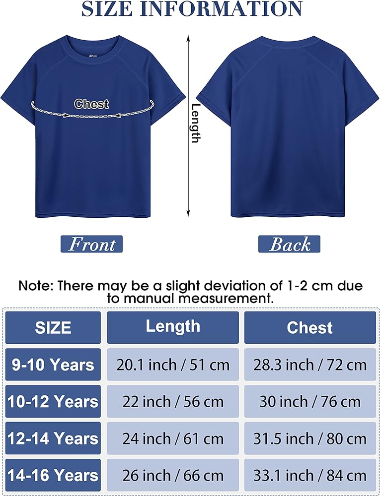 Boys UPF 50+ Rash Guard: you will receive 2 packs of rash guard designed specifically for boys; with multiple colors and sizes to choose from, you can find an ideal fit for your boys; please check the size carefully before purchasing; the classic colors and trendy styles will help your child create a fashionable summer look