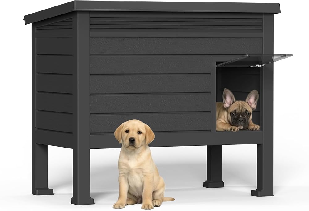 DRATO Indoor & Outdoor Resin Dog House with Raised Floor and Easy Assembly - Small Breed Shelter Featuring Louvered Vents, Spiked Legs, and Sloped Roof,Black