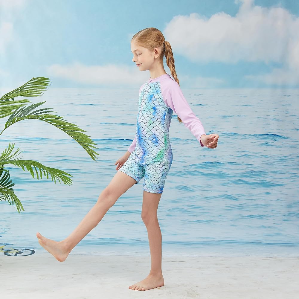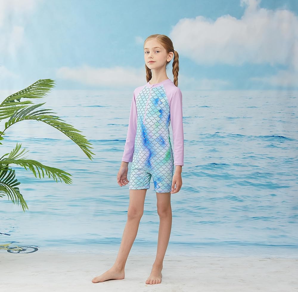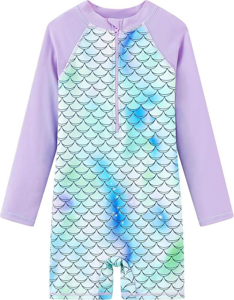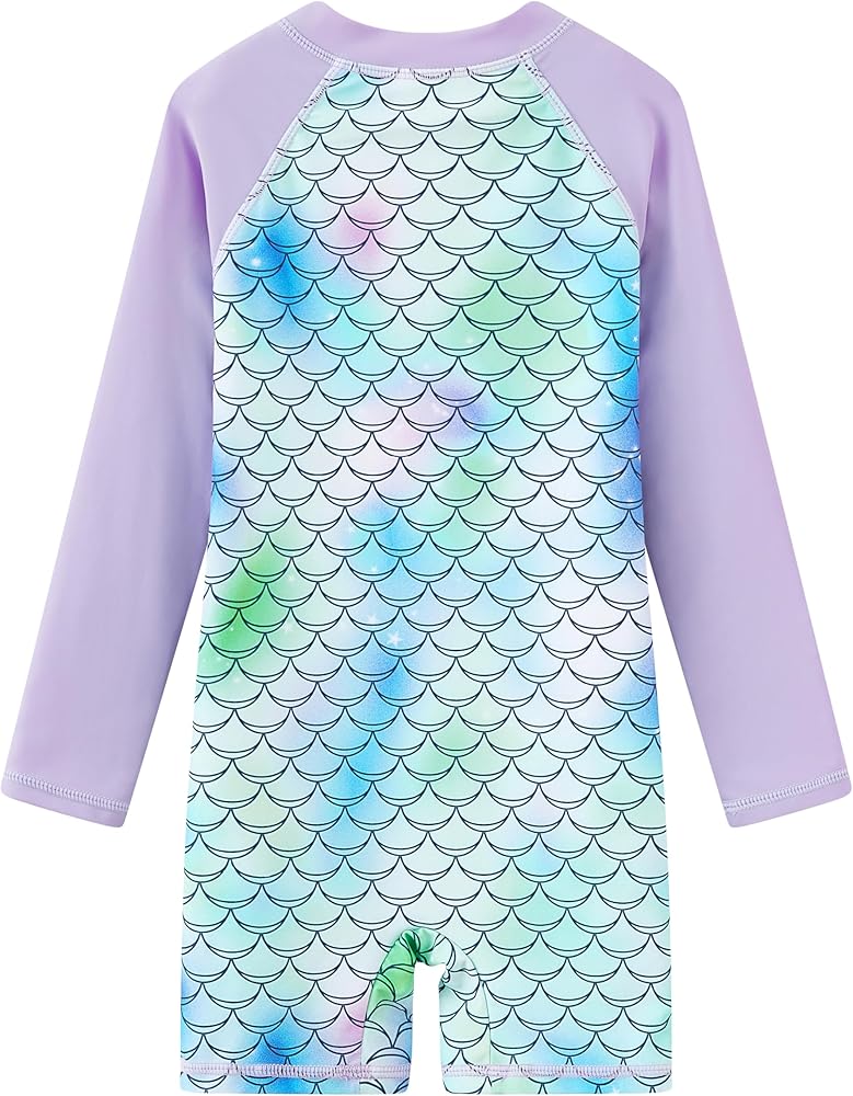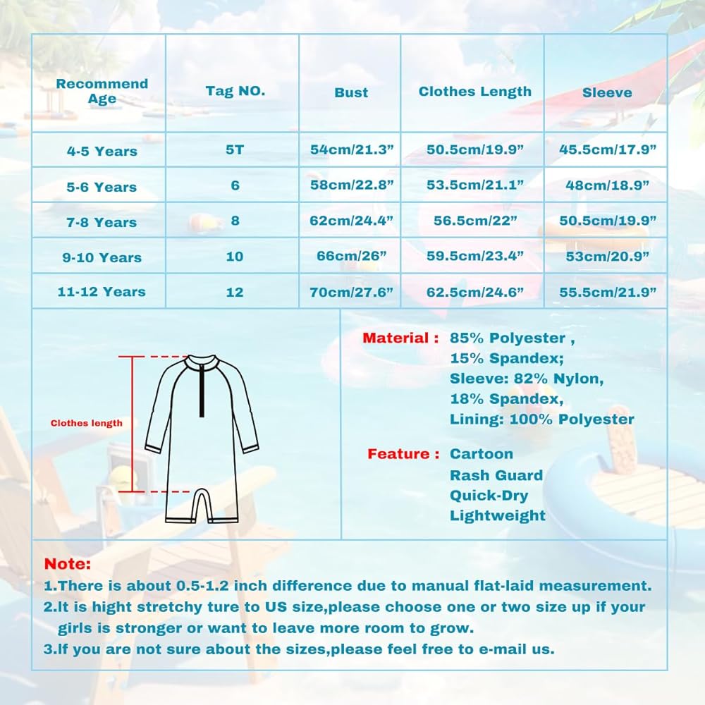 نسيج عالي الجودة: بدلة استحمام للفتيات بأكمام طويلة للحماية من الطفح الجلدي، مرنة لملاءمة مثالية، صديقة للبشرة، سريعة الجفاف، مسامية، مريحة وناعمة، سهلة التنظيف ومقاومة للبقع.