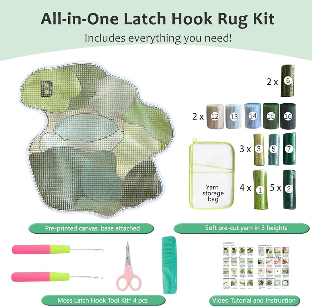 [All-in-One Kit for Craft Lovers] Everything you need is included: pre-printed mesh canvas with finished edges, a durable non-slip base already attached, soft pre-cut yarns in 3 lengths, and even special Pomp-A-Doodle yarn in Pattern A for playful texture. Also includes 2 latch hooks, bent-tip scissors, comb, a step-by-step video tutorial, and a printed instruction guide. Designed to make rug-making fun and easy!