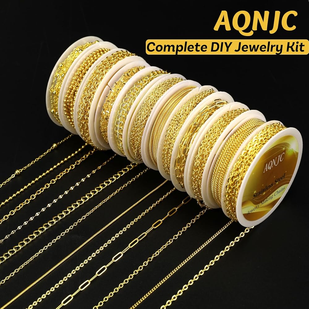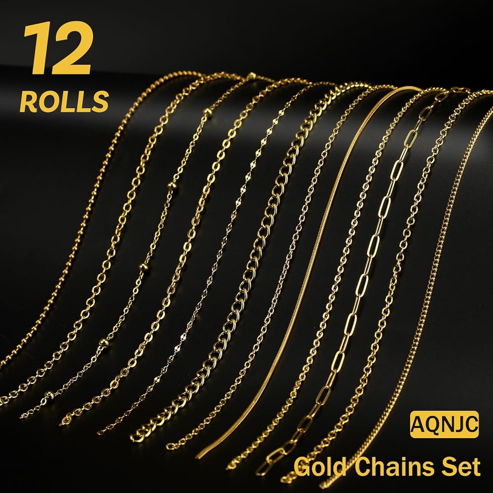 12 Rolls of Jewelry Chains (88 Feet Total) – This set offers a variety of chain styles, including classic cable chains, delicate satellite chains, paperclip chains, snake chains, bead chains, and more. With different textures and thicknesses, you can mix and match to create layered jewelry or single-piece designs.