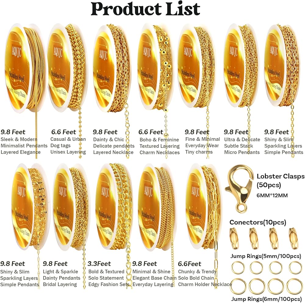 • Complete DIY Jewelry Kit: This jewelry chains bulk includes 12 rolls of stylish jewelry chains (98 feet total) in assorted designs, along with jump rings(200 pcs), lobster clasps(50 pcs), and connectors(10 pcs), giving you everything needed for crafting necklaces, bracelets, anklets, and more