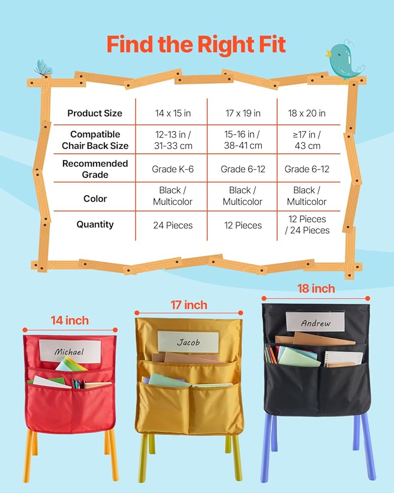 خيارات متعددة الاستخدامات: متوفرة بأحجام وكميات متعددة لتناسب احتياجات الفصل الدراسي. يعد الجزء الخلفي من منظم الكرسي مثاليًا للهدايا التي تعود إلى المدرسة ، والحفاظ على تنظيم المكاتب ، وخلق بيئة تعليمية أكثر كفاءة.
