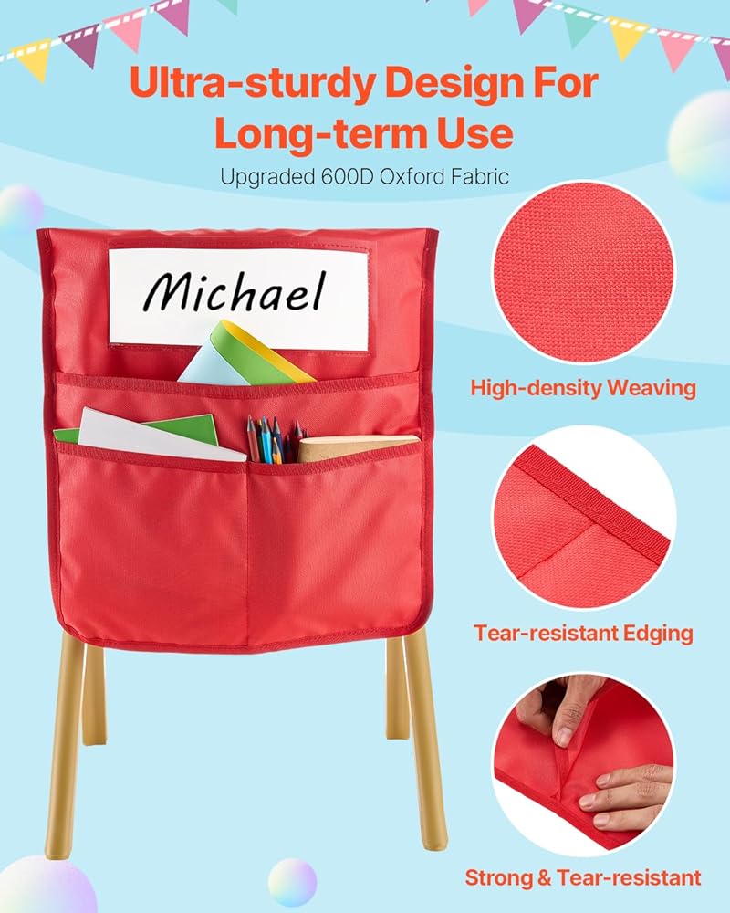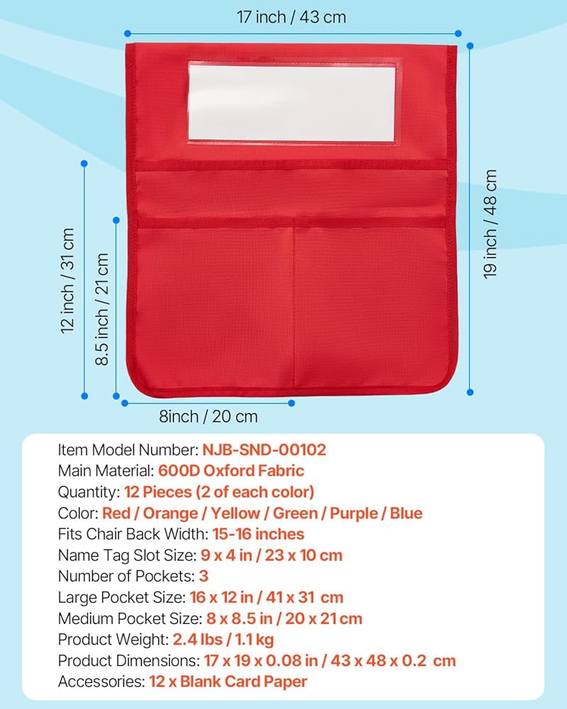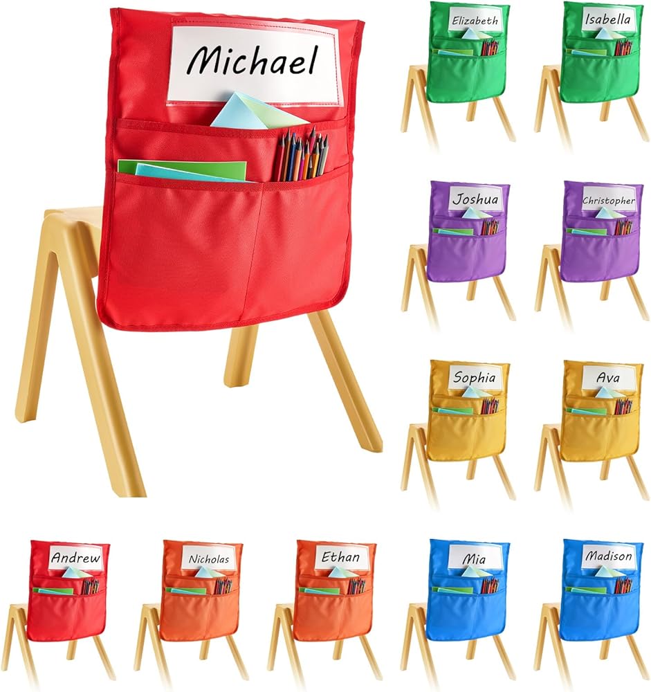 مجموعة الجيب من 24 قطعة: احصل على 24 جيوب كرسي ملونة باللون الأحمر والبرتقالي والأصفر والأخضر والأرجواني والأزرق-4 من كل لون! يتضمن 24 علامة اسم قابلة للاستبدال ، مثالية للصف K-6. كل حقيبة 14 × 15 بوصة تناسب ظهور كرسي 12-13 بوصة-رائعة لتنظيم المكاتب والحفاظ على كل شيء في متناول اليد!