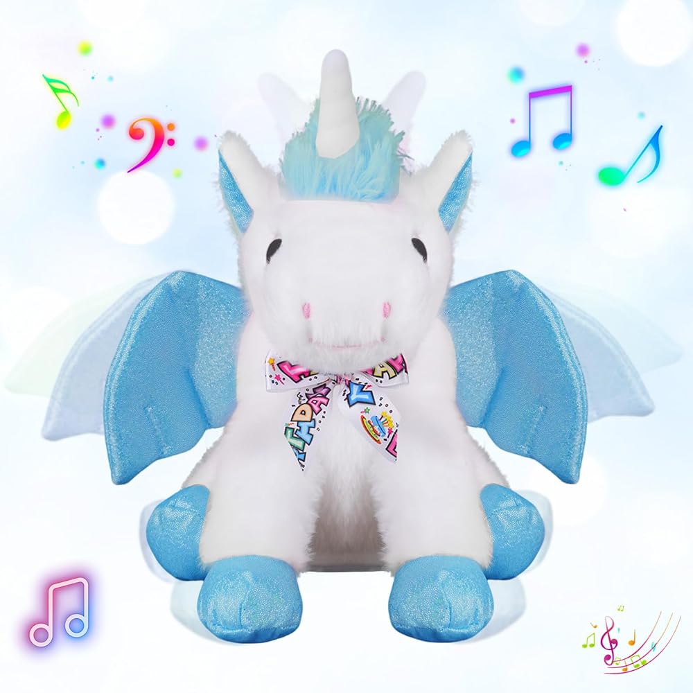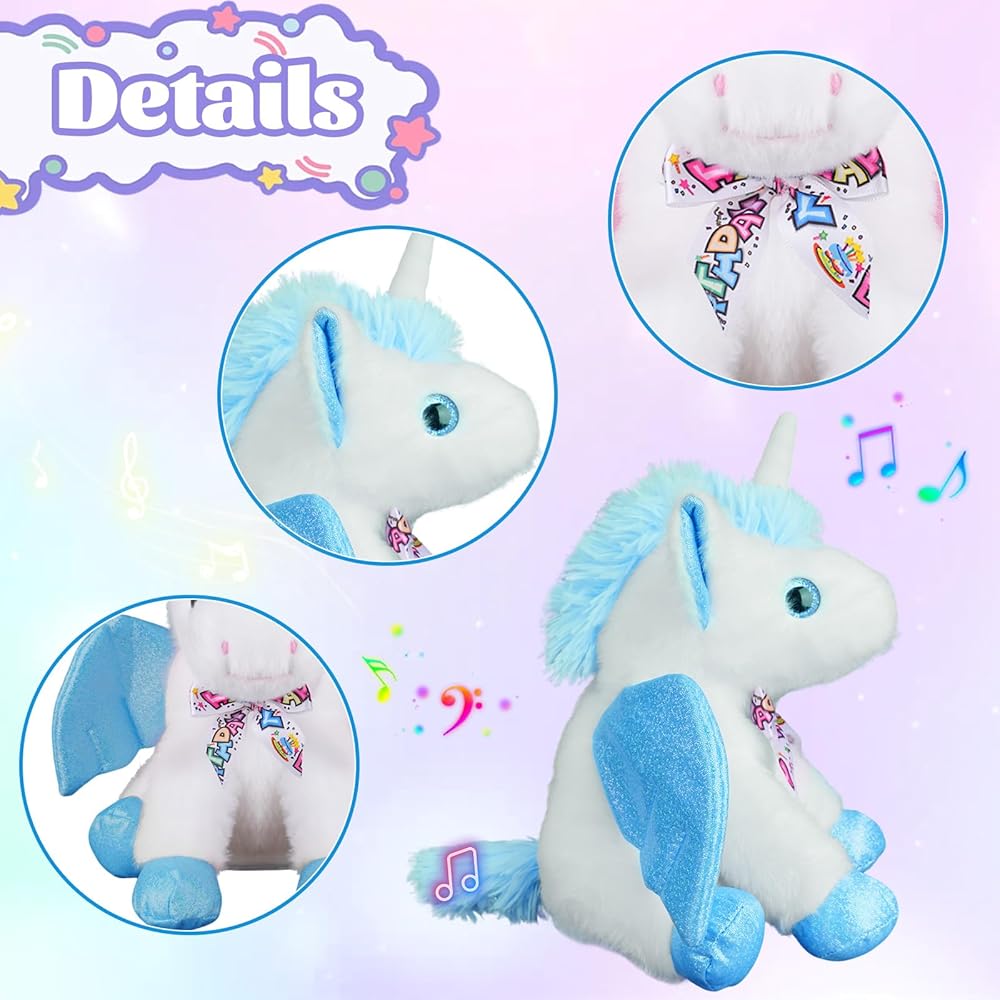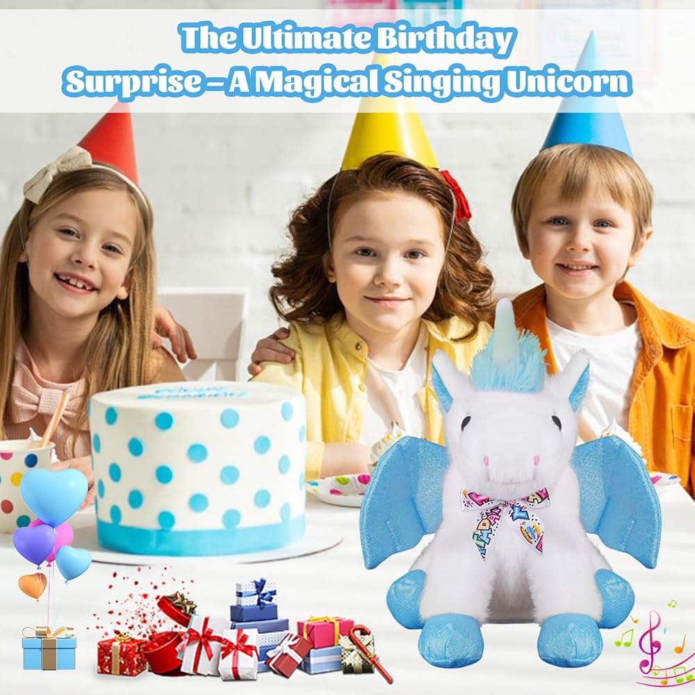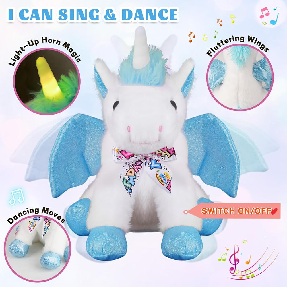 Make Birthdays Magical with This Singing Unicorn-Press the button on its leg and let the magic begin! This adorable unicorn plush sings the “Happy Birthday” song, moves its body, flaps its wings, and lights up its horn—creating an unforgettable birthday moment for any child,Interactive Fun – Sound, Light & Movement- Not just a plush toy—this unicorn comes to life with glowing lights and gentle motion. Its horn lights up in dazzling colors while the wings and body gently move to the music, capturing kids' attention and adding joy to every celebration.