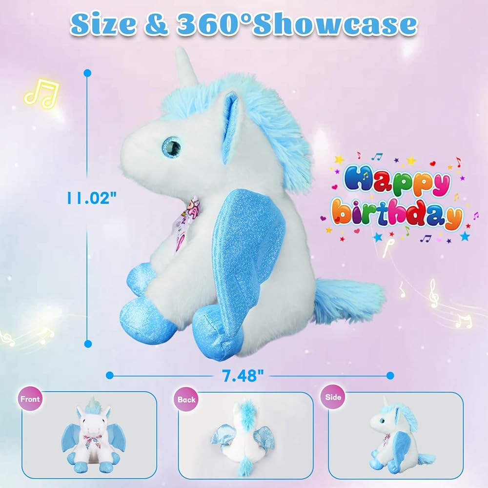 Singing Dancing Unicorn Stuffed Animail With Moving Wings,Happy Birthday Gifts Unicorn Plush Toy The Cormers Glowing Singing Happy Birthday Song,Party Gift for Toddlers Boys Girls Kids, 11" Blue