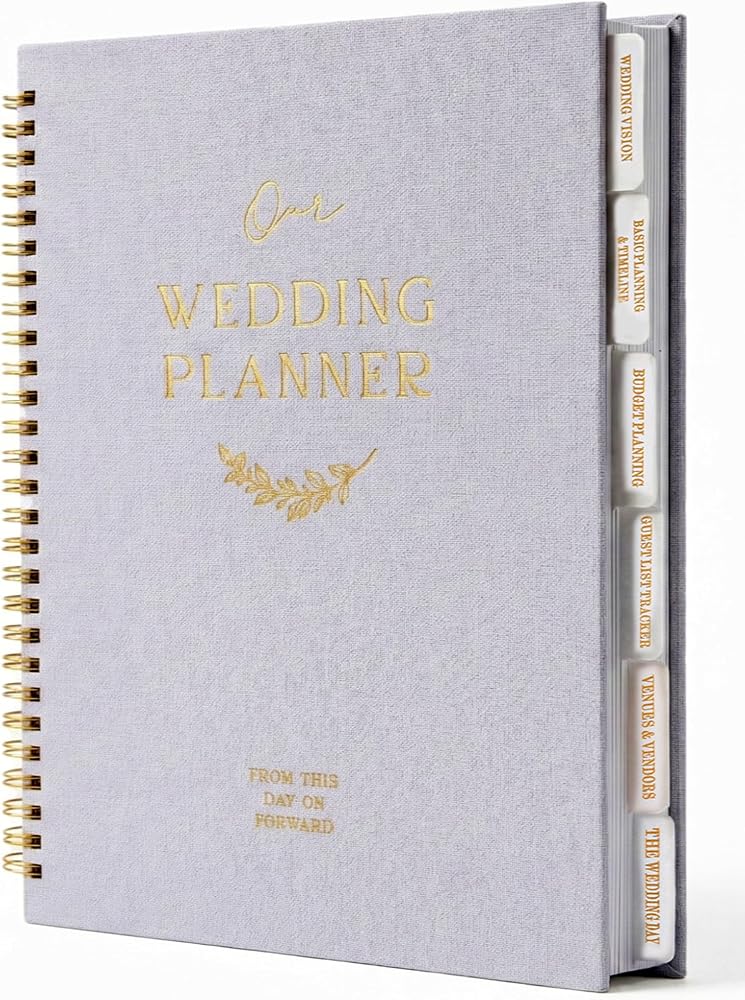 Plan your big day with confidence using this all-in-one Wedding Planner Book and Organizer for the Bride. Thoughtfully designed for brides-to-be, it features 6 detailed sections, 121 pages of checklists, timelines, and budget tools, plus an 18-month calendar. The elegant linen cover and gold foil detail add a luxurious touch, making it the perfect engagement gift or bridal shower gift. Inside, you'll find everything from guest list tracking and vendor comparison to honeymoon planning and wedding day essentials. Unlike cheap binders or bulky kits, our spiral-bound planner is compact, purse-friendly, and beautiful enough to display. Whether you're gifting it to a newly engaged friend or using it to organize your own dream wedding, this planner is your ultimate companion on the journey to “I Do”. Perfect for: brides, maid of honor gifts, wedding party planning, engagement planners, bridal notebooks, and more.