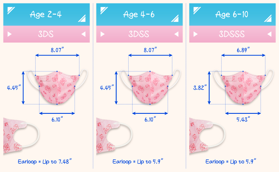 Blue Eagle 3D Kids Mask is one of the best kid masks because its comprehensive design takes care of every aspect you need for a perfect kid mask. There are totally 4 layers to help filter unwelcome particles. 3D fitting keeps your children away from dangerous sharp metal while still making masks stay tight on faces. Also, we provide 3 different sizes to different ages and faces, so that you don't need to worry about the closure quality of any wrong size. Ultrasonic Welding tech gives the earloop ultra stretchability, and you don't need to worry the strap gets broken anymore. Finally, we know some kids get problems of skin irritation and allergy, and our Thermal-Bonded Inner Layer provides a silky texture to reduce all of the discomfort caused by rough material.