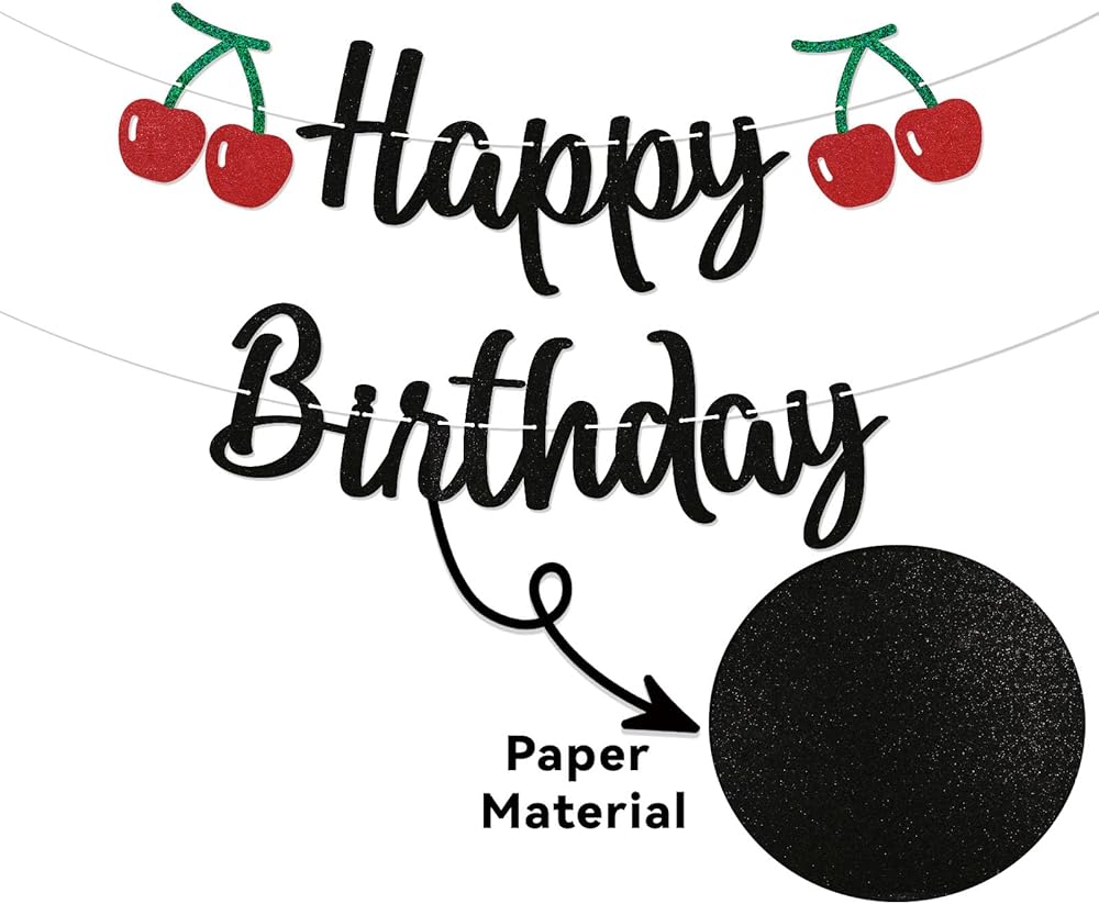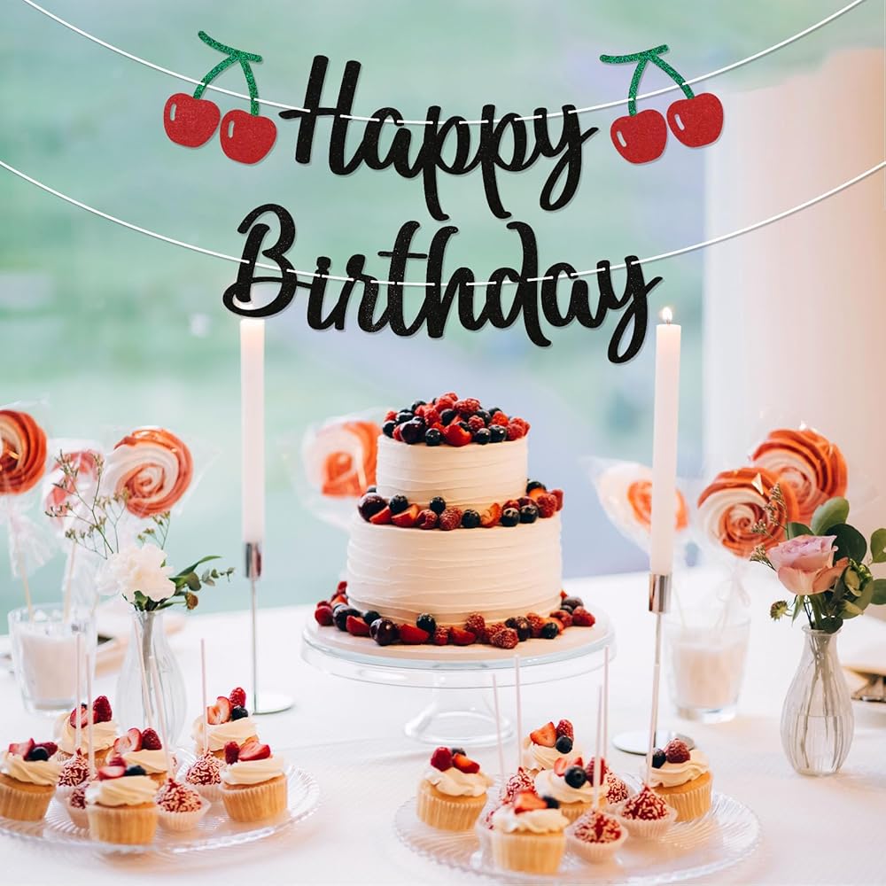PACKAGE INCLUDES - 1 piece of glittery banner that spells out Happy Birthday and two cherry in the end.